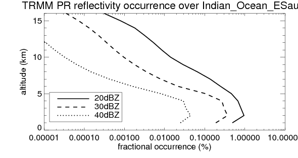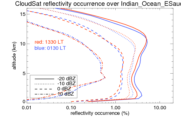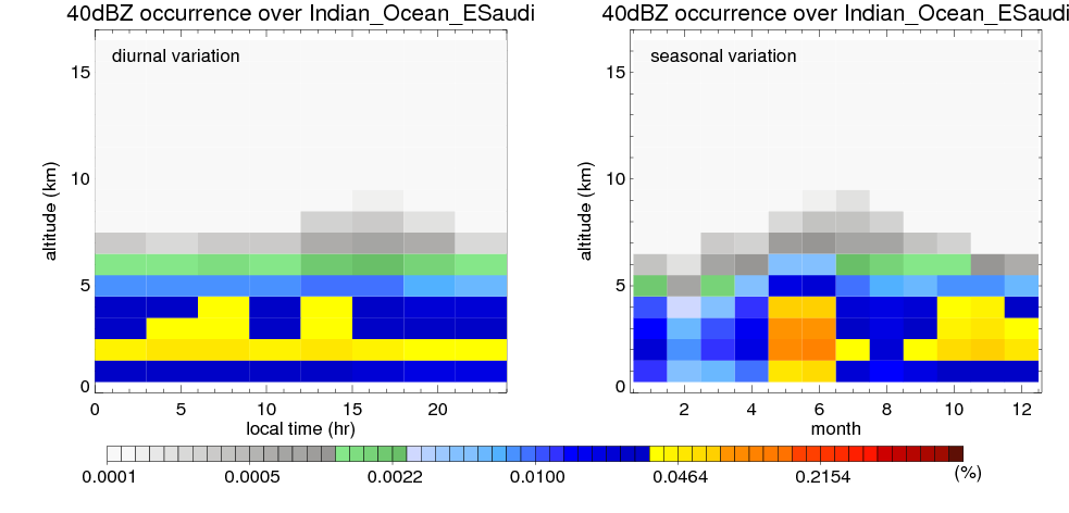 Here the precipitation means the precipitable hydrometeors (raindrops, snow flakes, graupel and hails) that detected by TRMM precipitation radar. Following figure shows the vertical profiles of 20, 30 and 40 dBZ fractional occurrence over Indian_Ocean_ESaudi in different seasons. The seasonal and diurnal variations of precipitation (20 dBZ) fractional occurrence at different altitudes are shown below: The seasonal and diurnal variations of INTENSIVE precipitation (40 dBZ) fractional occurrence at different altitudes are shown below: Clouds are consisted of small hydrometeors that undetectable by TRMM precipitation radar (Ku band). CloudSat (W band radar) provides the much great details of clouds. Following figure shows the vertical structure of the thin and thick clouds over Indian_Ocean_ESaudi. Note that high reflectivity at low levels are less frequent due to the attenuation. The seasonal variation of thin (-20 dBZ) and thick (0 dBZ) cloud over Indian_Ocean_ESaudi are shown below: |