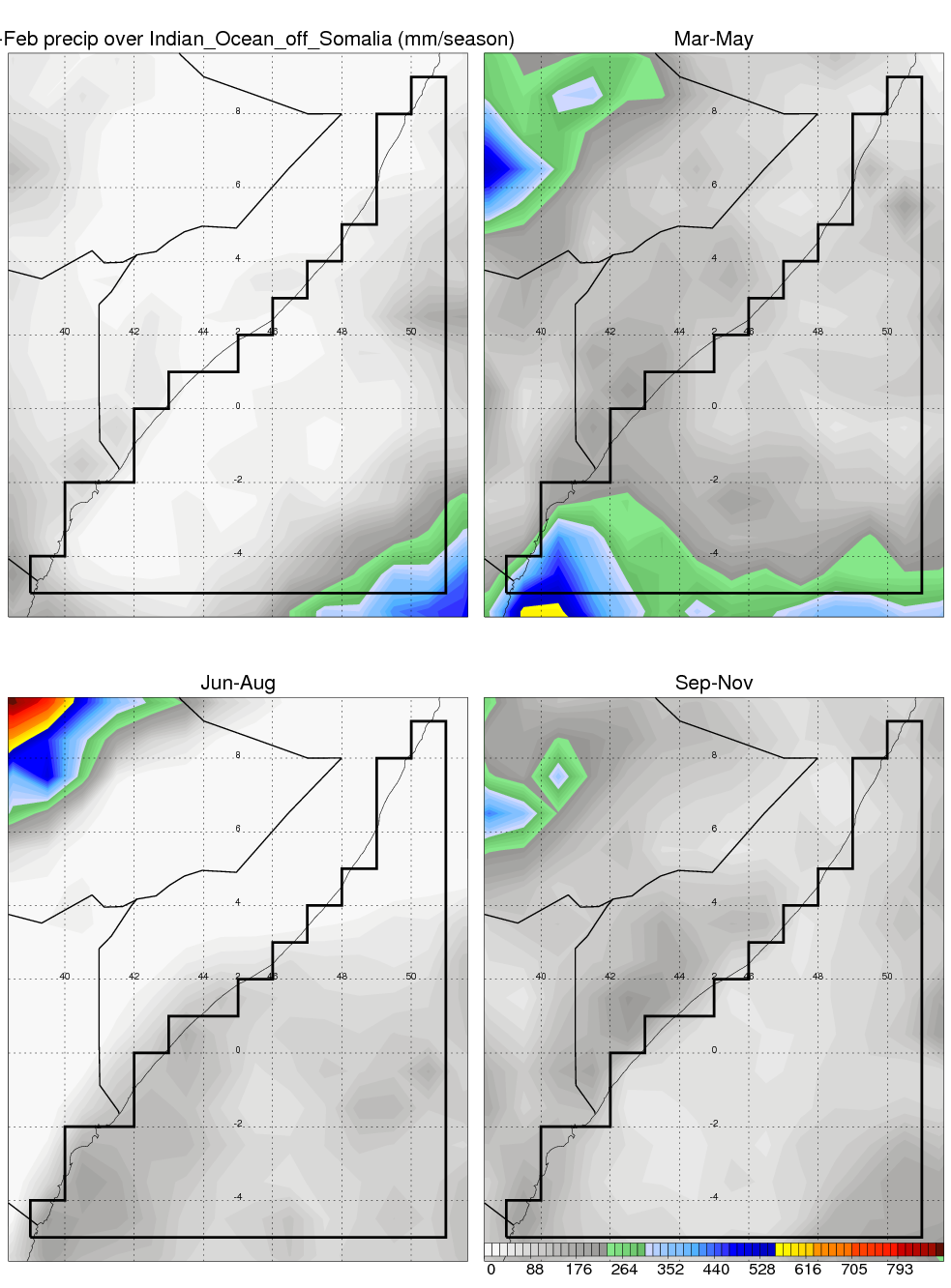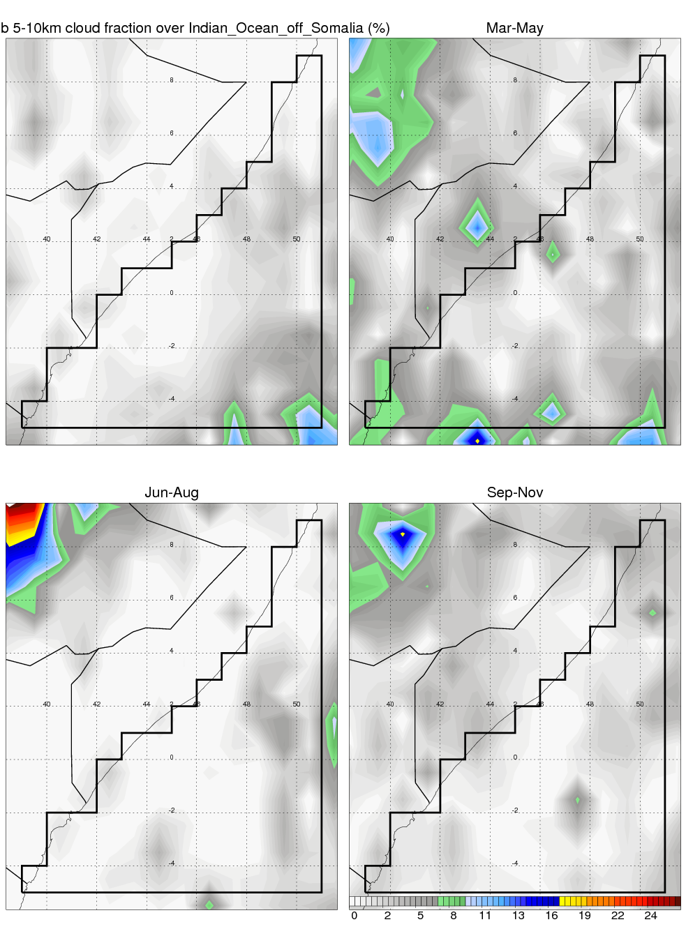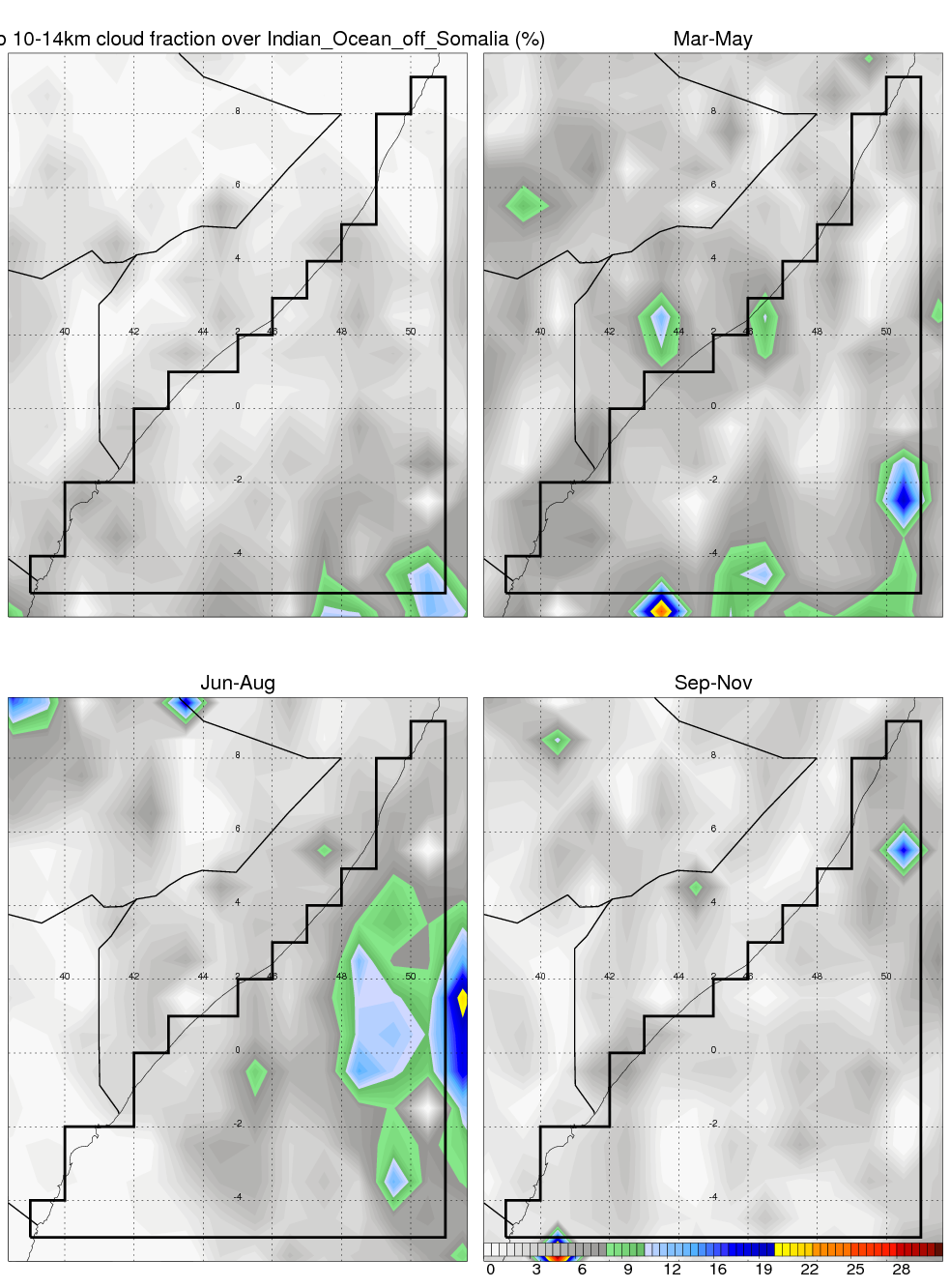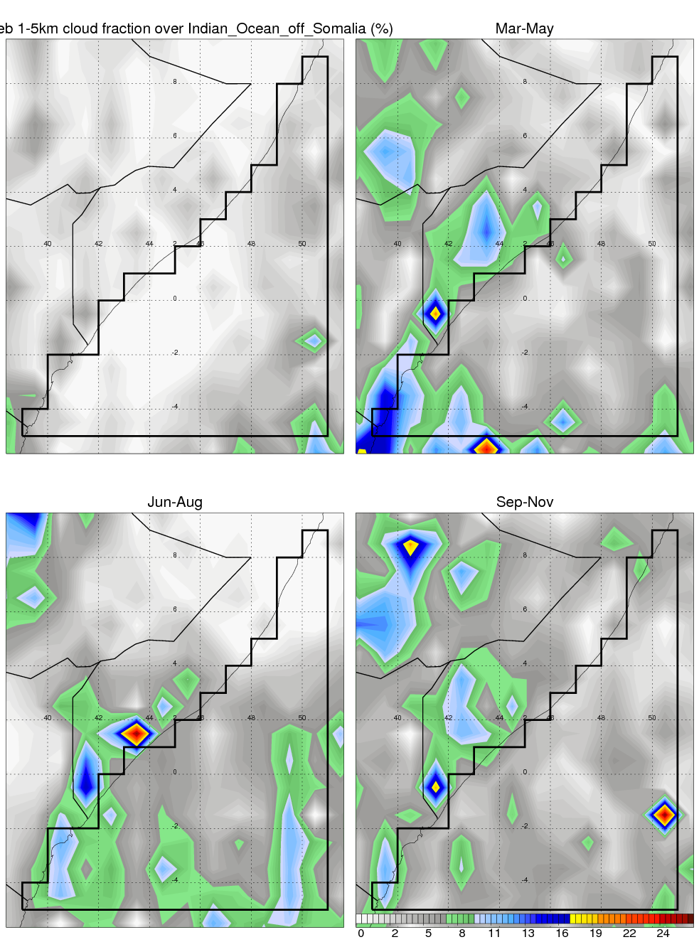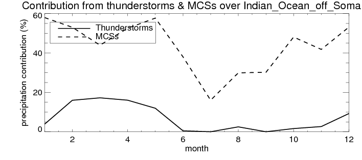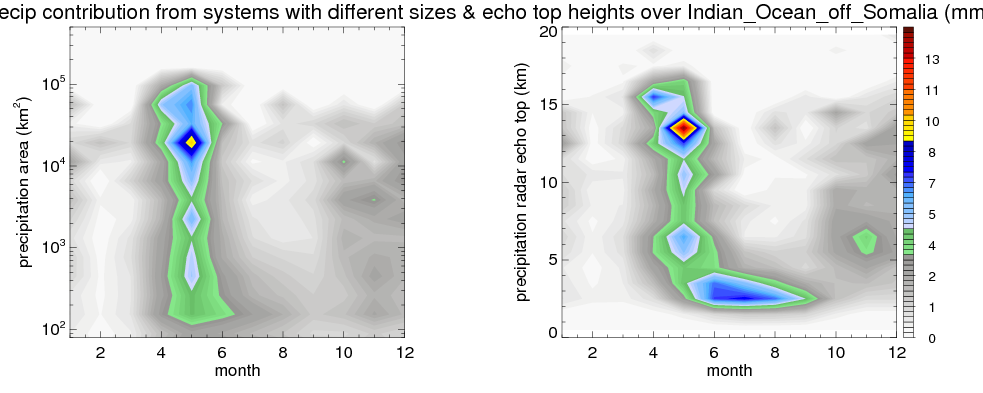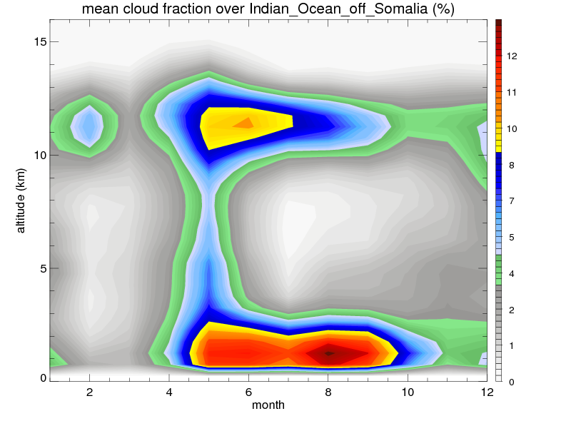 Over Indian_Ocean_off_Somalia , mean annual precipitation are estimated with 401.6 (mm/year) from TRMM precipitation radar. (distribution of precipitation see here ) Total surface rainfall is brought by various precipitation systems. The seasonal variation of precipitation from systems with different sizes and heights are shown below: In total, thunderstorms (systems with detected lightning flashes) contribute 7 %, MCSs (Mesoscale convective systems with raining area > 2000 km^2) contribute 46 % of all precipitation. Seasonal variations of fraction of precipitation from thunderstorms and MCSs are shown below: The seasonal variation of geographical distribution of CloudSat cloud fraction over Indian_Ocean_off_Somalia is shown below: The seasonal variation of mean CloudSat level cloud fraction at different altitudes over Indian_Ocean_off_Somalia is shown below: |