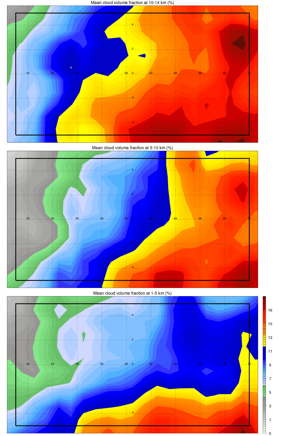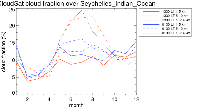 Over Seychelles_Indian_Ocean , mean high level (10-14 km) cloud volume fraction is about 13.5%. Mean mid level (5-10 km) cloud volume fraction is about 10.7%. Mean low level (1-5 km) cloud volume fraction is about 9.7%. Seasonal and day vs. night variations of high, mid and low level cloud fraction over Seychelles_Indian_Ocean are shown in following figure. You may check the details of cloud fraction in various seasons and at different local times. |