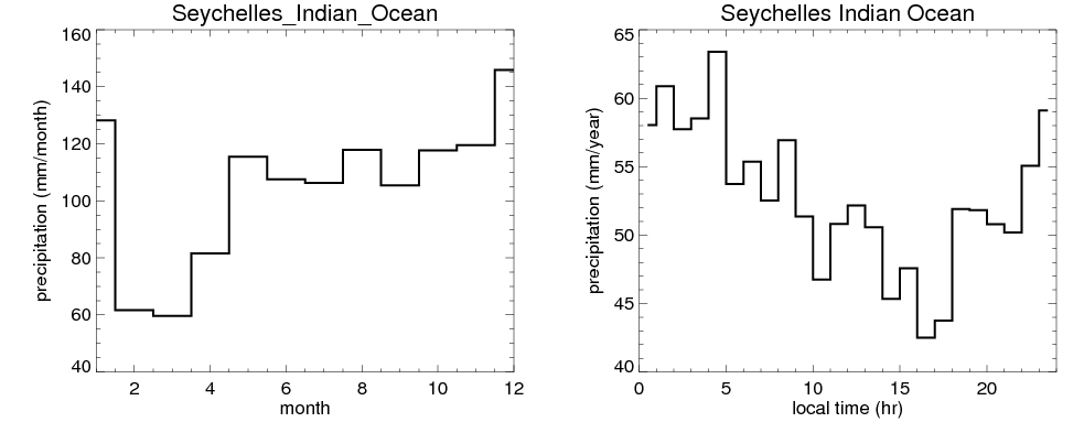 Over Seychelles_Indian_Ocean , mean annual precipitation are estimated with 1266.8 (mm/year) from precipitation radar, and 1115.4 (mm/year) from microwave radiometer observations. (see high resolution precipitation product , NOTE: it may take long time to generate for large area) In total, thunderstorms (systems with detected lightning flashes) contribute 12 %, MCSs (Mesoscale convective systems with raining area > 2000 km^2) contribute 62 % of all precipitation. Seasonal and diurnal variations of rainfall over Seychelles_Indian_Ocean are shown in following figure. You may check the details of rainfall contributions from precipitation systems with different sizes and intensities in various seasons and at different local times. |