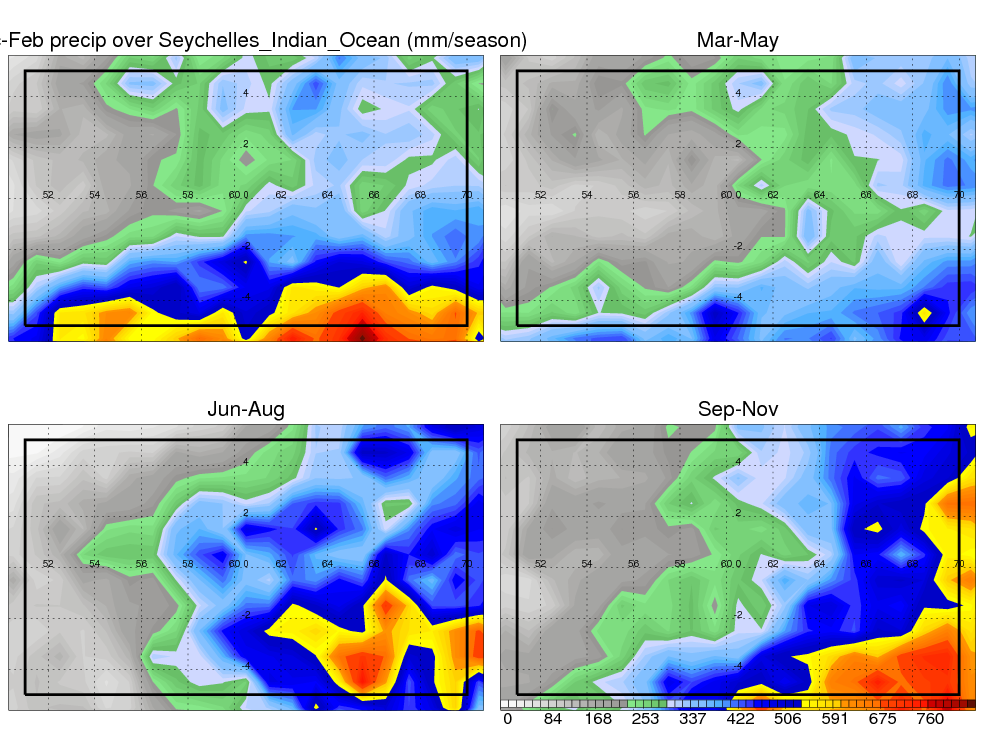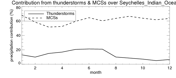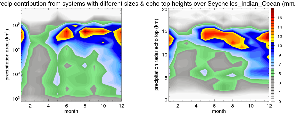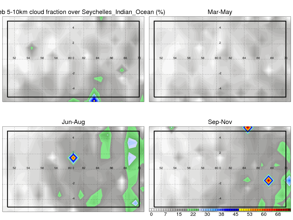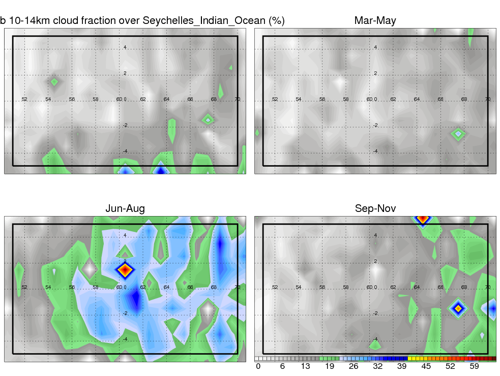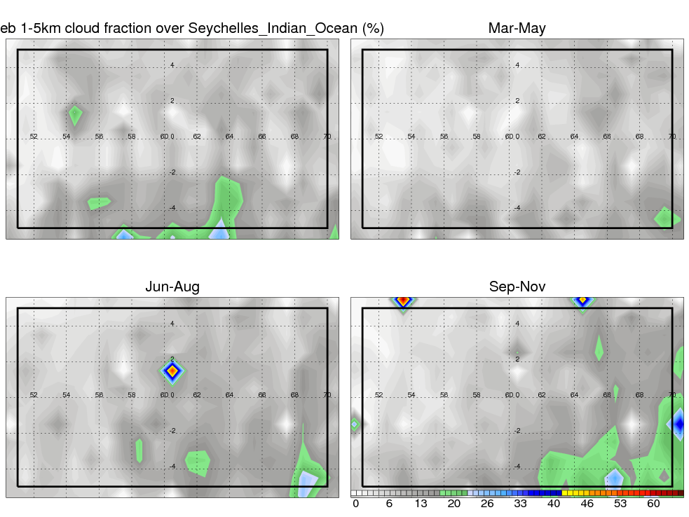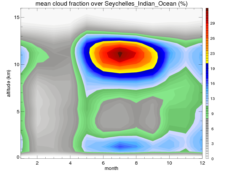 Over Seychelles_Indian_Ocean , mean annual precipitation are estimated with 1266.8 (mm/year) from TRMM precipitation radar. (distribution of precipitation see here ) Total surface rainfall is brought by various precipitation systems. The seasonal variation of precipitation from systems with different sizes and heights are shown below: In total, thunderstorms (systems with detected lightning flashes) contribute 12 %, MCSs (Mesoscale convective systems with raining area > 2000 km^2) contribute 62 % of all precipitation. Seasonal variations of fraction of precipitation from thunderstorms and MCSs are shown below: The seasonal variation of geographical distribution of CloudSat cloud fraction over Seychelles_Indian_Ocean is shown below: The seasonal variation of mean CloudSat level cloud fraction at different altitudes over Seychelles_Indian_Ocean is shown below: |