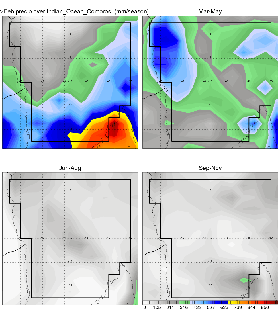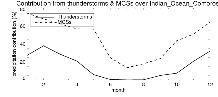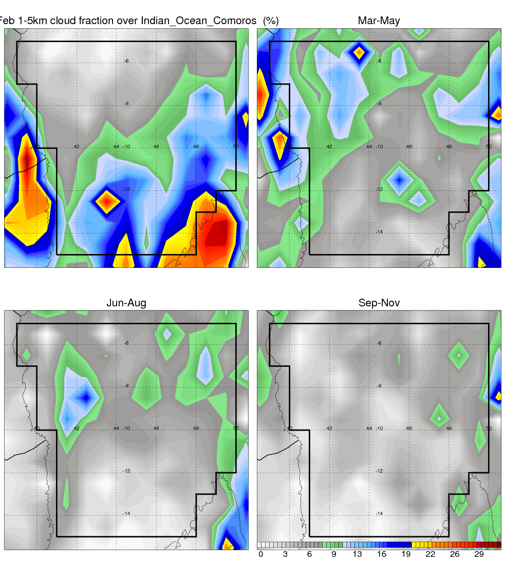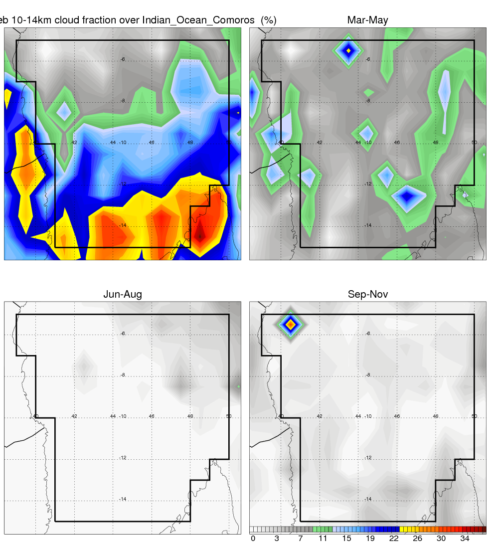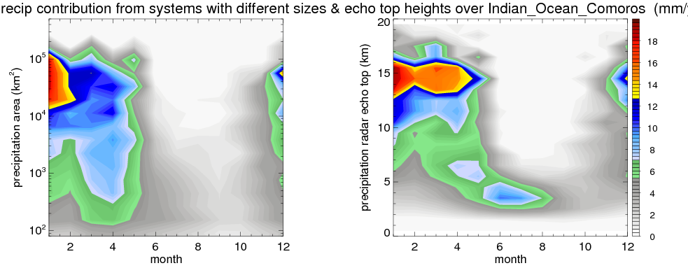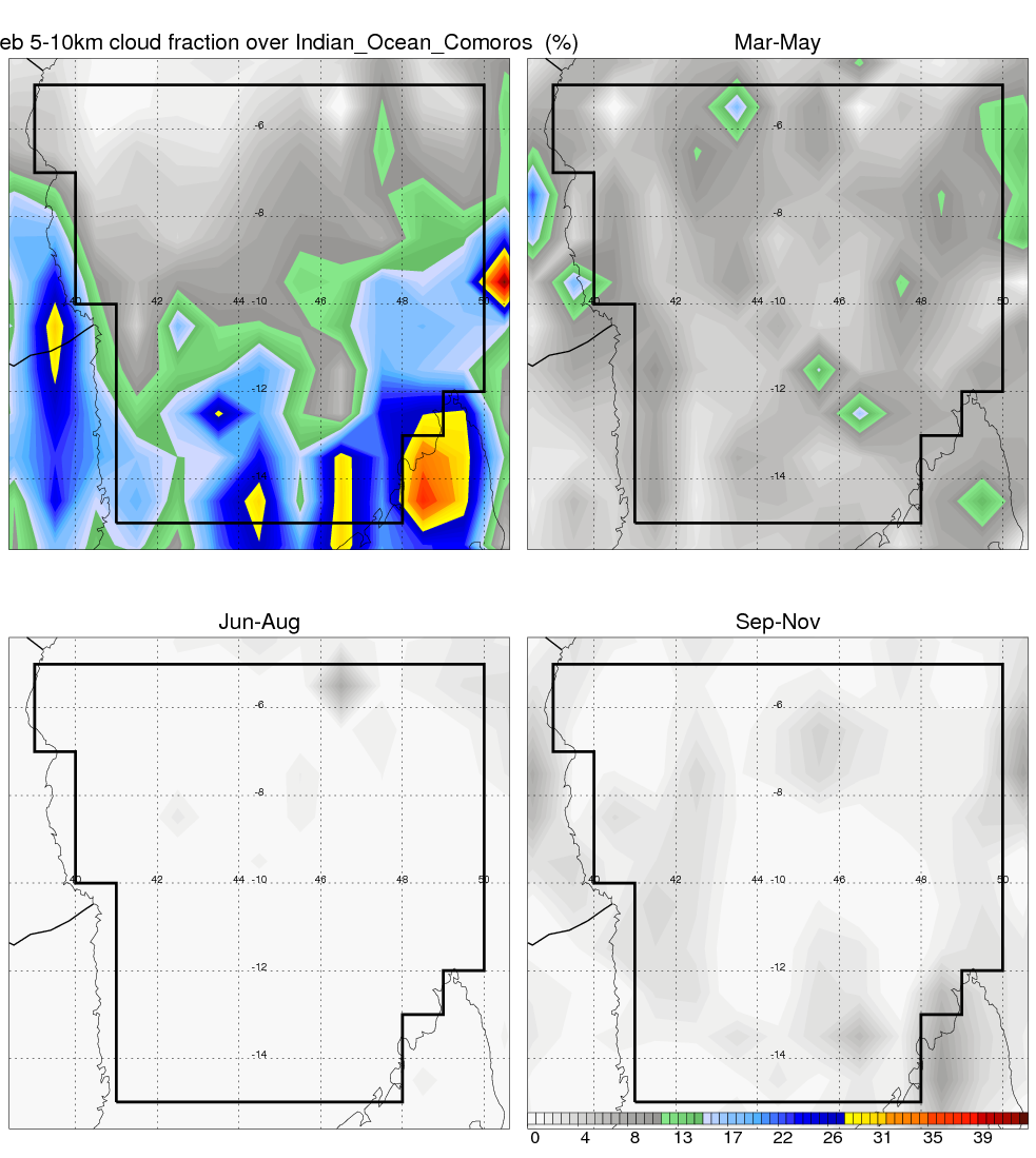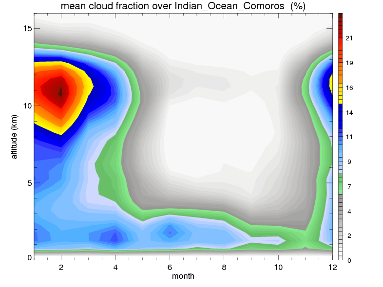 Over Indian_Ocean_Comoros , mean annual precipitation are estimated with 888.8 (mm/year) from TRMM precipitation radar. (distribution of precipitation see here ) Total surface rainfall is brought by various precipitation systems. The seasonal variation of precipitation from systems with different sizes and heights are shown below: In total, thunderstorms (systems with detected lightning flashes) contribute 22 %, MCSs (Mesoscale convective systems with raining area > 2000 km^2) contribute 58 % of all precipitation. Seasonal variations of fraction of precipitation from thunderstorms and MCSs are shown below: The seasonal variation of geographical distribution of CloudSat cloud fraction over Indian_Ocean_Comoros is shown below: The seasonal variation of mean CloudSat level cloud fraction at different altitudes over Indian_Ocean_Comoros is shown below: |