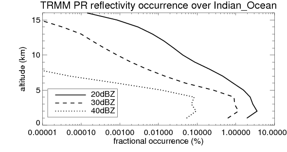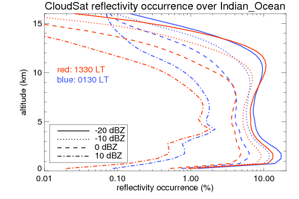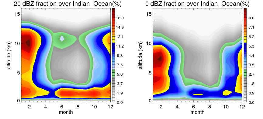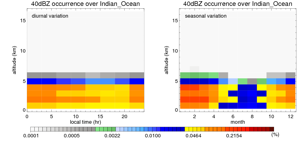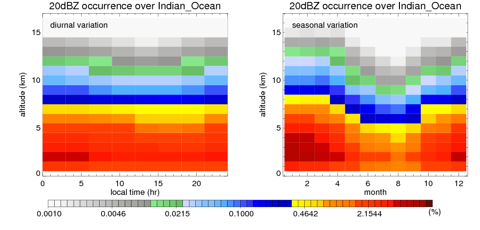 Here the precipitation means the precipitable hydrometeors (raindrops, snow flakes, graupel and hails) that detected by TRMM precipitation radar. Following figure shows the vertical profiles of 20, 30 and 40 dBZ fractional occurrence over Indian_Ocean in different seasons. The seasonal and diurnal variations of precipitation (20 dBZ) fractional occurrence at different altitudes are shown below: The seasonal and diurnal variations of INTENSIVE precipitation (40 dBZ) fractional occurrence at different altitudes are shown below: Clouds are consisted of small hydrometeors that undetectable by TRMM precipitation radar (Ku band). CloudSat (W band radar) provides the much great details of clouds. Following figure shows the vertical structure of the thin and thick clouds over Indian_Ocean. Note that high reflectivity at low levels are less frequent due to the attenuation. The seasonal variation of thin (-20 dBZ) and thick (0 dBZ) cloud over Indian_Ocean are shown below: |