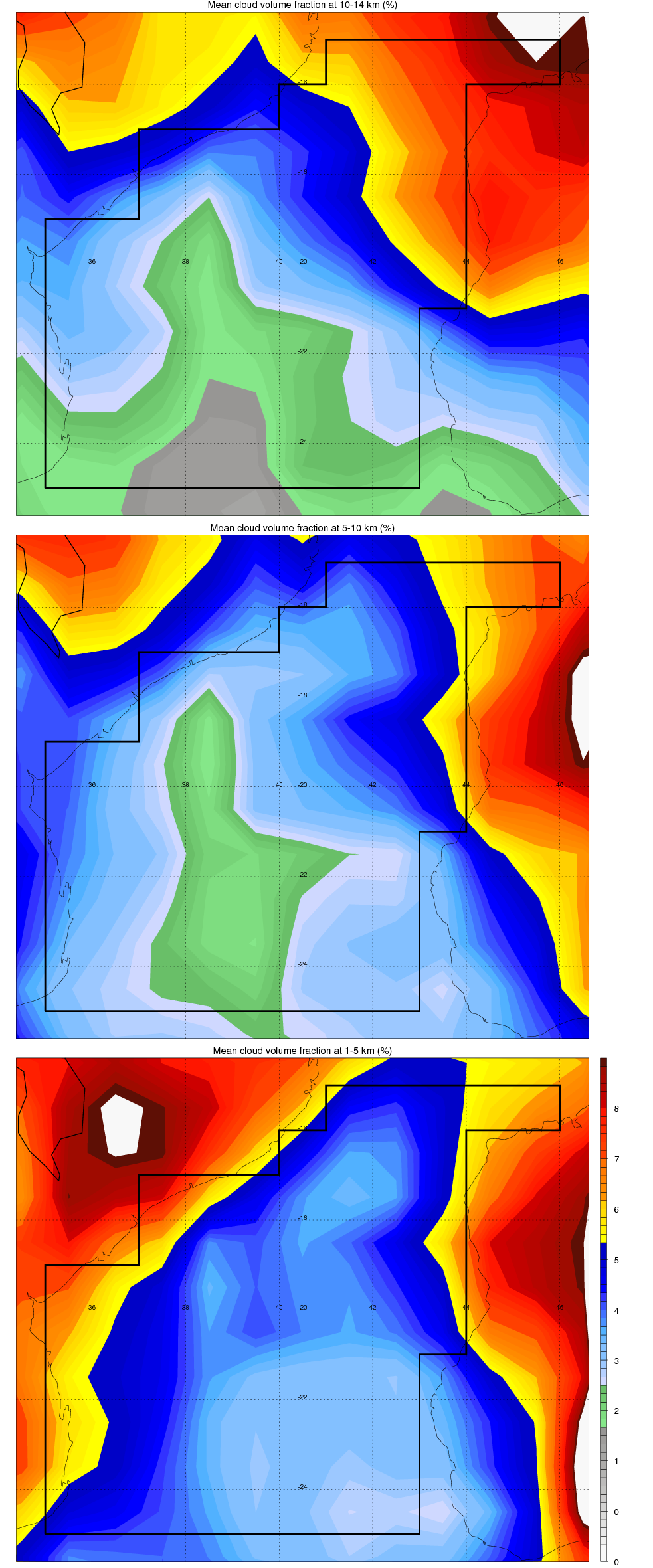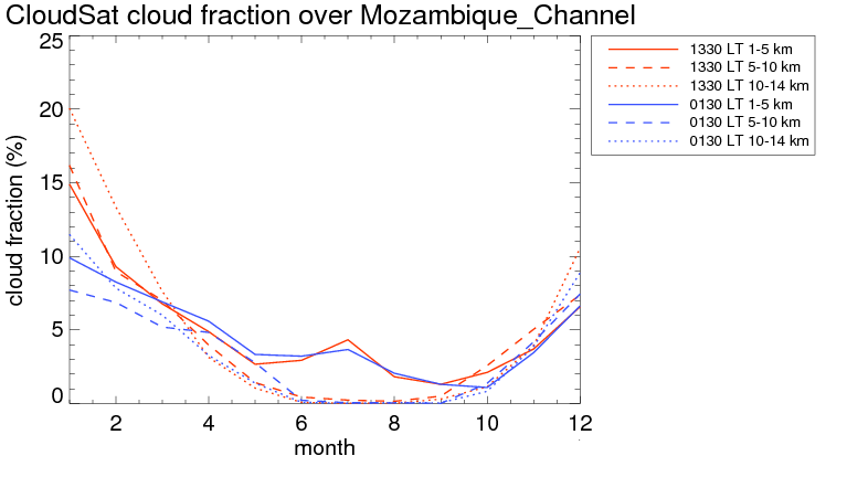 Over Mozambique_Channel , mean high level (10-14 km) cloud volume fraction is about 4.2%. Mean mid level (5-10 km) cloud volume fraction is about 3.8%. Mean low level (1-5 km) cloud volume fraction is about 4.7%. Seasonal and day vs. night variations of high, mid and low level cloud fraction over Mozambique_Channel are shown in following figure. You may check the details of cloud fraction in various seasons and at different local times. |