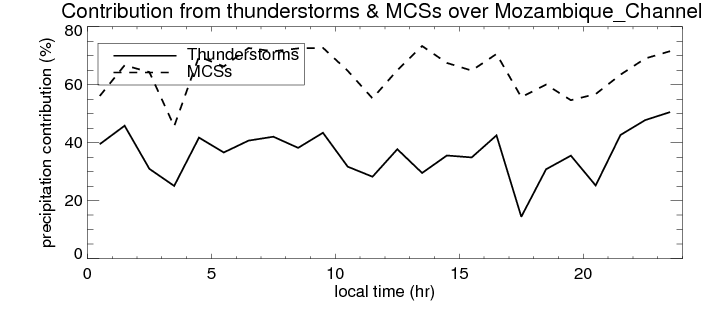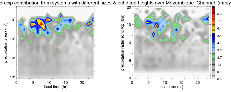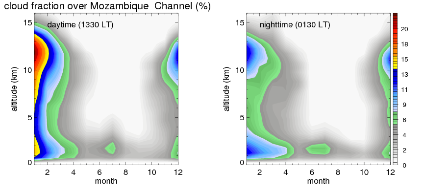 Many studies suggested that the diurnal variation of the precipitation is related to the life cycles of the precipitation systems, which is frequently driven by the surface sensible heating. Over Mozambique_Channel , mean annual precipitation are estimated with 650.9 (mm/year) from precipitation radar. Detailed diurnal variation of the precipitation at high resolution can be accessed here (NOTE: it may take long time to generate for a large area). The diurnal variation of precipitation from systems with different sizes and heights are shown below: In total, thunderstorms (systems with detected lightning flashes) contribute 37 %, MCSs (Mesoscale convective systems with raining area > 2000 km^2) contribute 66 % of all precipitation over Mozambique_Channel . Diurnal variations of fraction of precipitation from thunderstorms and MCSs over Mozambique_Channel are shown below: Certainly there is a strong diurnal variation of different types of clouds. Because CloudSat observes at 0130 and 1330 local time, here the daytime and night cloud fraction in different seasons are presented: |