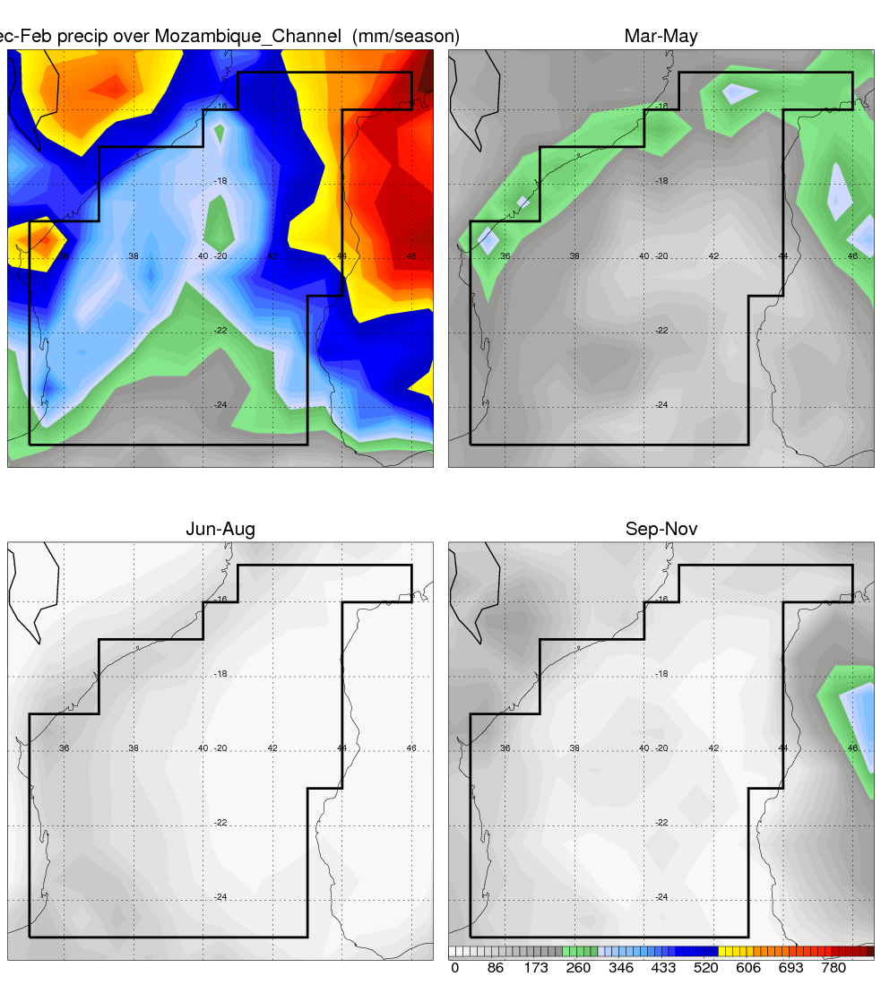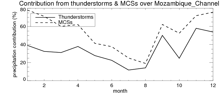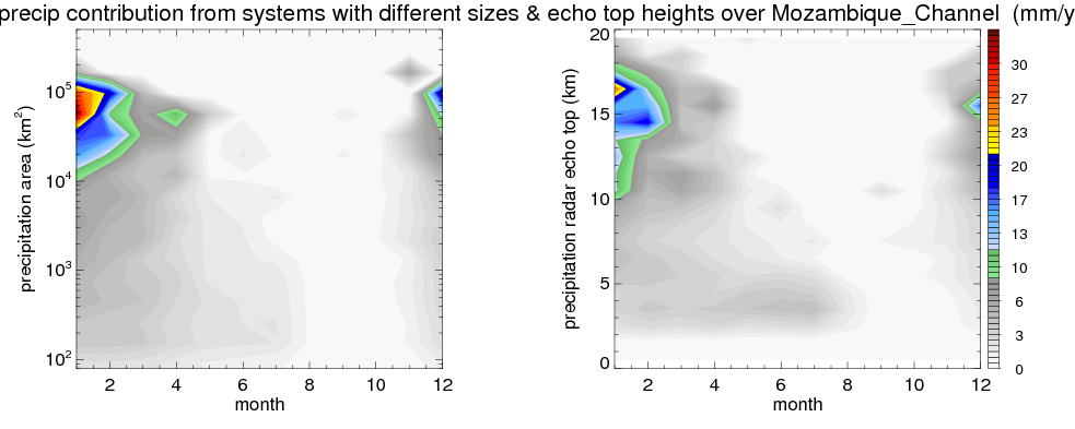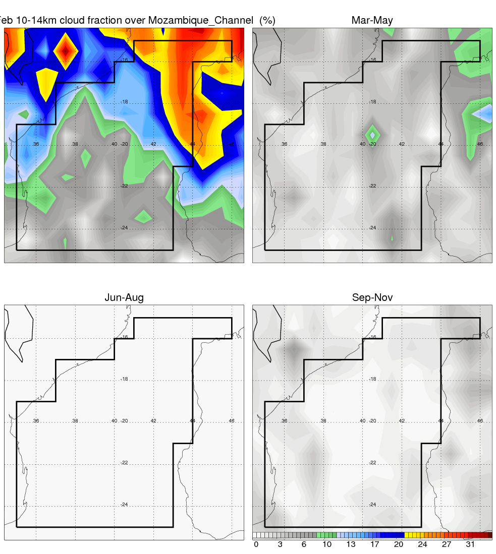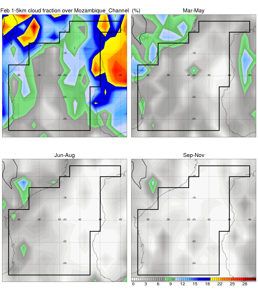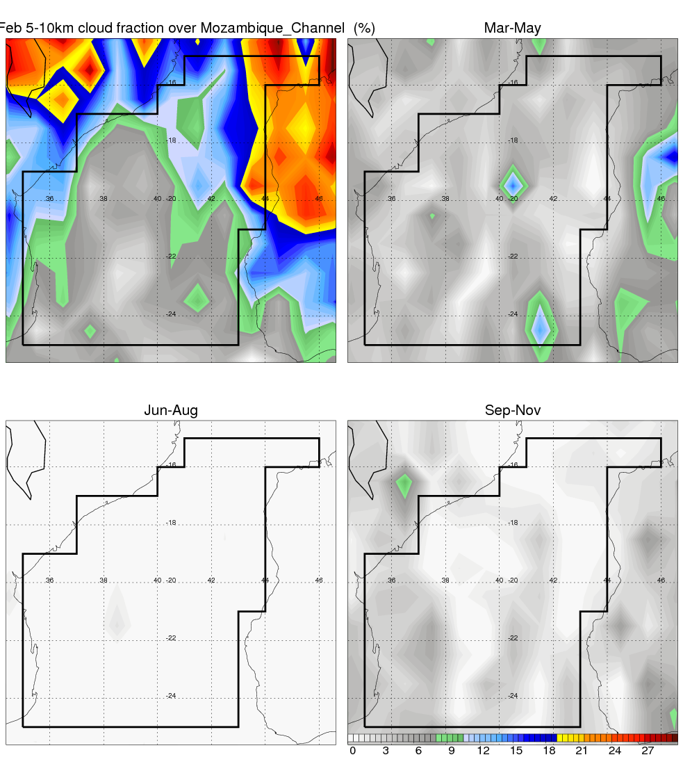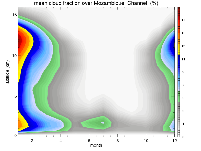Over Mozambique_Channel , mean annual precipitation are estimated with 650.9 (mm/year) from TRMM precipitation radar. (distribution of precipitation see here ) Total surface rainfall is brought by various precipitation systems. The seasonal variation of precipitation from systems with different sizes and heights are shown below: In total, thunderstorms (systems with detected lightning flashes) contribute 37 %, MCSs (Mesoscale convective systems with raining area > 2000 km^2) contribute 66 % of all precipitation. Seasonal variations of fraction of precipitation from thunderstorms and MCSs are shown below: The seasonal variation of geographical distribution of CloudSat cloud fraction over Mozambique_Channel is shown below: The seasonal variation of mean CloudSat level cloud fraction at different altitudes over Mozambique_Channel is shown below: |