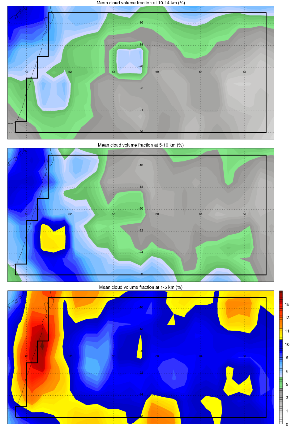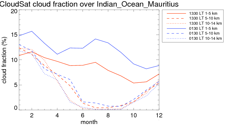Over Indian_Ocean_Mauritius , mean high level (10-14 km) cloud volume fraction is about 4.1%. Mean mid level (5-10 km) cloud volume fraction is about 4.7%. Mean low level (1-5 km) cloud volume fraction is about 9.9%. Seasonal and day vs. night variations of high, mid and low level cloud fraction over Indian_Ocean_Mauritius are shown in following figure. You may check the details of cloud fraction in various seasons and at different local times. |