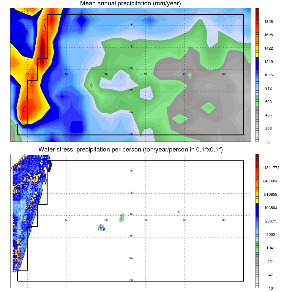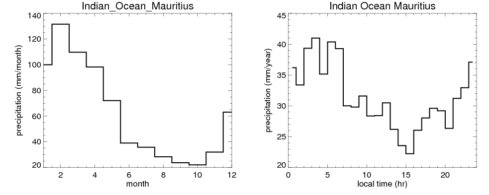 Over Indian_Ocean_Mauritius , mean annual precipitation are estimated with 755.8 (mm/year) from precipitation radar, and 800.1 (mm/year) from microwave radiometer observations. (see high resolution precipitation product , NOTE: it may take long time to generate for large area) In total, thunderstorms (systems with detected lightning flashes) contribute 15 %, MCSs (Mesoscale convective systems with raining area > 2000 km^2) contribute 55 % of all precipitation. Seasonal and diurnal variations of rainfall over Indian_Ocean_Mauritius are shown in following figure. You may check the details of rainfall contributions from precipitation systems with different sizes and intensities in various seasons and at different local times. |
