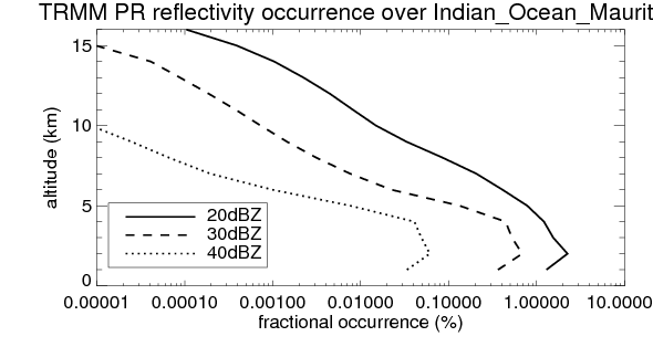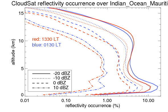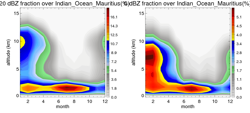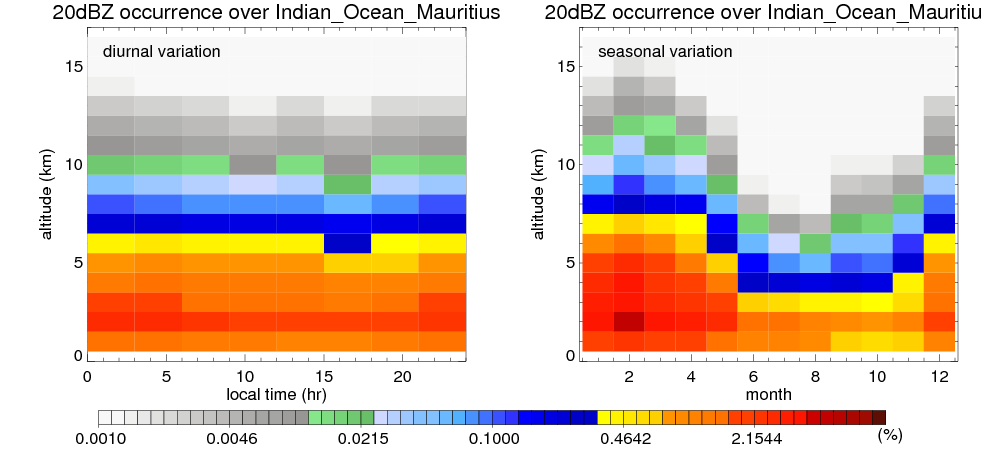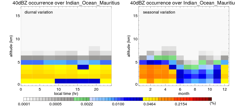 Here the precipitation means the precipitable hydrometeors (raindrops, snow flakes, graupel and hails) that detected by TRMM precipitation radar. Following figure shows the vertical profiles of 20, 30 and 40 dBZ fractional occurrence over Indian_Ocean_Mauritius in different seasons. The seasonal and diurnal variations of precipitation (20 dBZ) fractional occurrence at different altitudes are shown below: The seasonal and diurnal variations of INTENSIVE precipitation (40 dBZ) fractional occurrence at different altitudes are shown below: Clouds are consisted of small hydrometeors that undetectable by TRMM precipitation radar (Ku band). CloudSat (W band radar) provides the much great details of clouds. Following figure shows the vertical structure of the thin and thick clouds over Indian_Ocean_Mauritius. Note that high reflectivity at low levels are less frequent due to the attenuation. The seasonal variation of thin (-20 dBZ) and thick (0 dBZ) cloud over Indian_Ocean_Mauritius are shown below: |