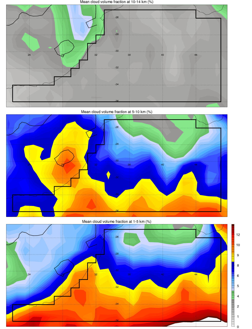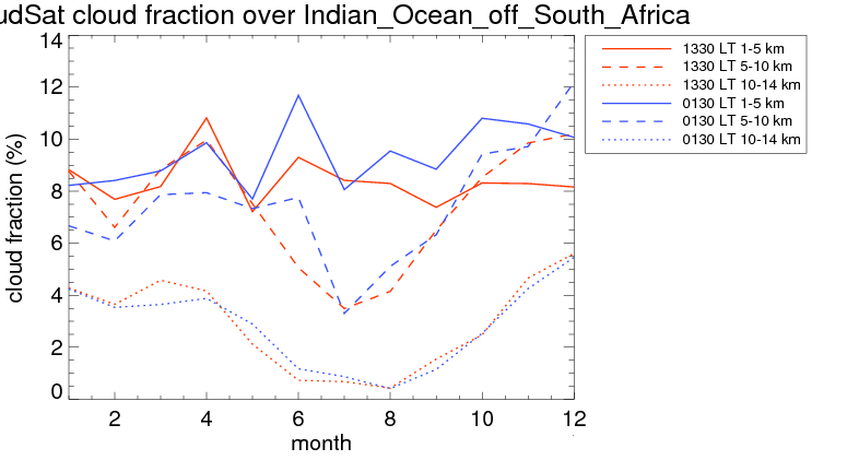 Over Indian_Ocean_off_South_Africa , mean high level (10-14 km) cloud volume fraction is about 2.8%. Mean mid level (5-10 km) cloud volume fraction is about 7.4%. Mean low level (1-5 km) cloud volume fraction is about 8.8%. Seasonal and day vs. night variations of high, mid and low level cloud fraction over Indian_Ocean_off_South_Africa are shown in following figure. You may check the details of cloud fraction in various seasons and at different local times. |