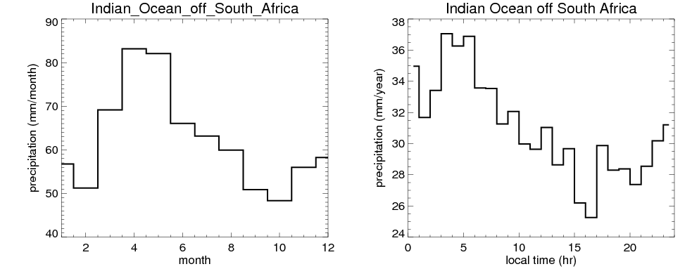 Over Indian_Ocean_off_South_Africa , mean annual precipitation are estimated with 744.9 (mm/year) from precipitation radar, and 728.8 (mm/year) from microwave radiometer observations. (see high resolution precipitation product , NOTE: it may take long time to generate for large area) In total, thunderstorms (systems with detected lightning flashes) contribute 45 %, MCSs (Mesoscale convective systems with raining area > 2000 km^2) contribute 77 % of all precipitation. Seasonal and diurnal variations of rainfall over Indian_Ocean_off_South_Africa are shown in following figure. You may check the details of rainfall contributions from precipitation systems with different sizes and intensities in various seasons and at different local times. |