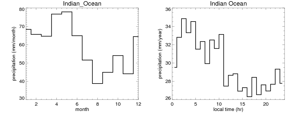 Over Indian_Ocean , mean annual precipitation are estimated with 715.8 (mm/year) from precipitation radar, and 801.2 (mm/year) from microwave radiometer observations. (see high resolution precipitation product , NOTE: it may take long time to generate for large area) In total, thunderstorms (systems with detected lightning flashes) contribute 20 %, MCSs (Mesoscale convective systems with raining area > 2000 km^2) contribute 80 % of all precipitation. Seasonal and diurnal variations of rainfall over Indian_Ocean are shown in following figure. You may check the details of rainfall contributions from precipitation systems with different sizes and intensities in various seasons and at different local times. |