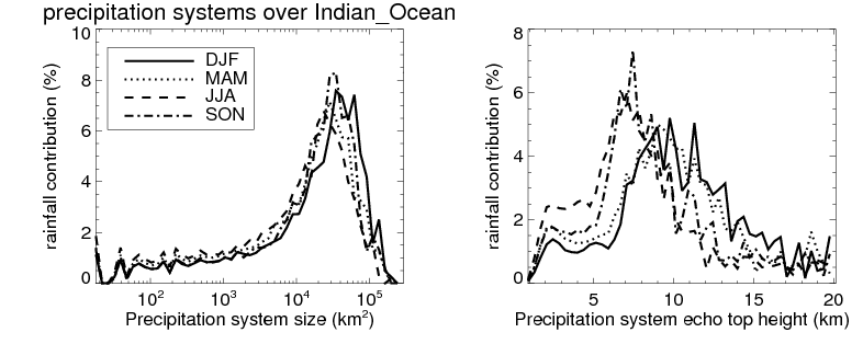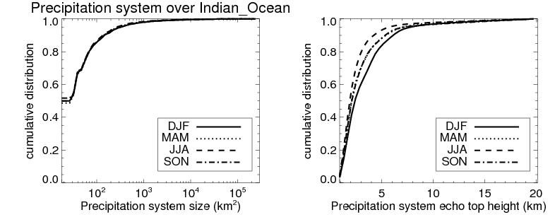 Over Indian_Ocean , mean size of precipitation system about 242.9 (km^2) and mean maximum radar echo top height of these precipitation systems is about 3.3 km. Following figure shows the cumulative distribution of the sizes and depths of the precipitation systems in different seasons: Though usually there are more small systems, the larger systems would bring more total precipitation. |
