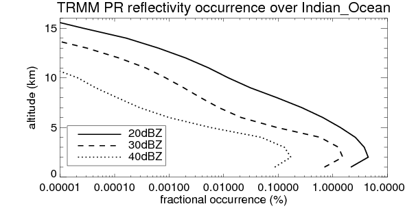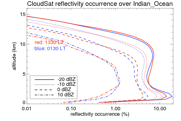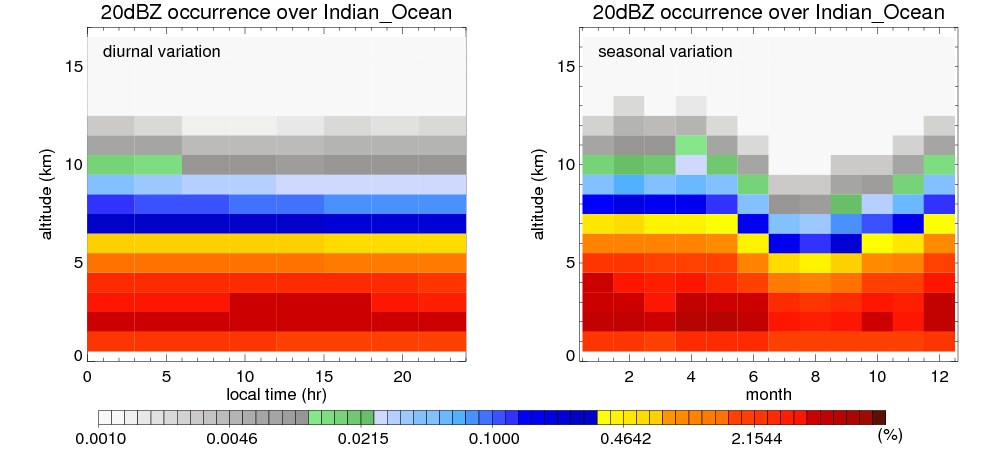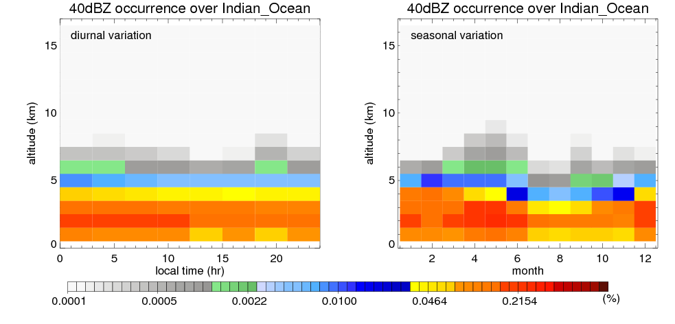Here the precipitation means the precipitable hydrometeors (raindrops, snow flakes, graupel and hails) that detected by TRMM precipitation radar. Following figure shows the vertical profiles of 20, 30 and 40 dBZ fractional occurrence over Indian_Ocean in different seasons. The seasonal and diurnal variations of precipitation (20 dBZ) fractional occurrence at different altitudes are shown below: The seasonal and diurnal variations of INTENSIVE precipitation (40 dBZ) fractional occurrence at different altitudes are shown below: Clouds are consisted of small hydrometeors that undetectable by TRMM precipitation radar (Ku band). CloudSat (W band radar) provides the much great details of clouds. Following figure shows the vertical structure of the thin and thick clouds over Indian_Ocean. Note that high reflectivity at low levels are less frequent due to the attenuation. The seasonal variation of thin (-20 dBZ) and thick (0 dBZ) cloud over Indian_Ocean are shown below: |