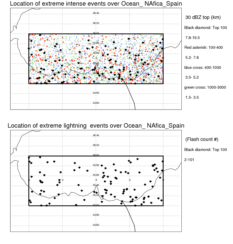 Following figure shows the location of the precipitation feautres categorized by the lightning rate and 30 dBZ echo top.
