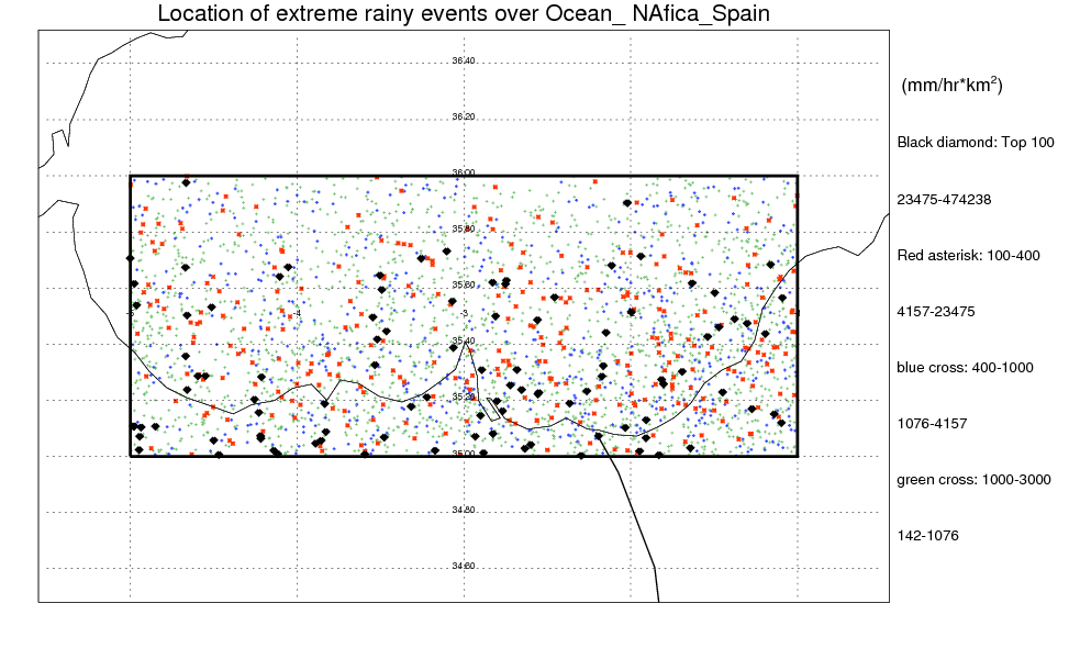 Following figure shows the location of the precipitation feautres categorized by the volumetric rainfall.