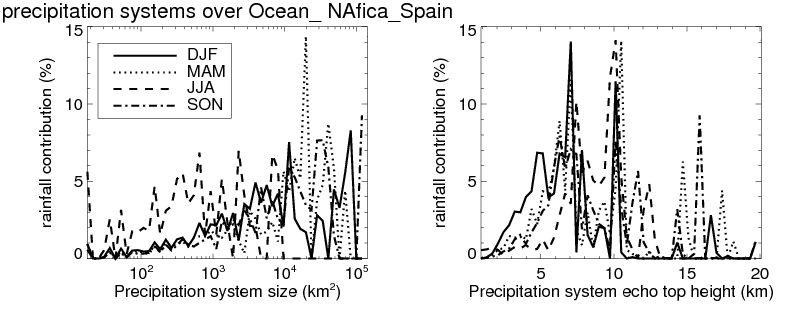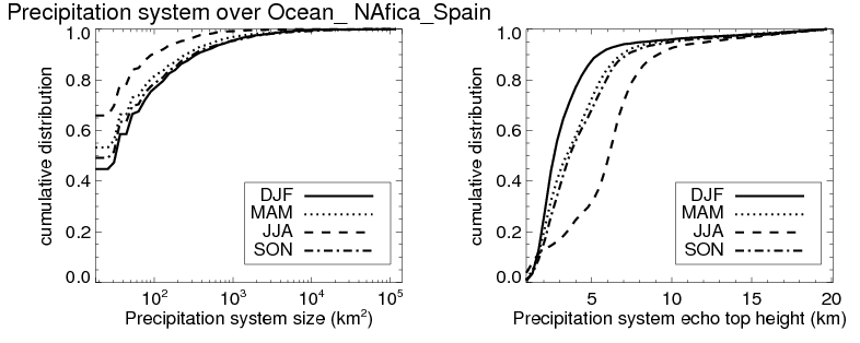 Over Ocean_ NAfica_Spain , mean size of precipitation system about 313.2 (km^2) and mean maximum radar echo top height of these precipitation systems is about 4.7 km. Following figure shows the cumulative distribution of the sizes and depths of the precipitation systems in different seasons: Though usually there are more small systems, the larger systems would bring more total precipitation. |