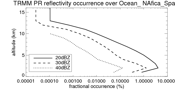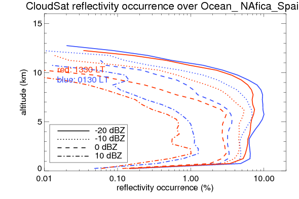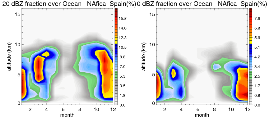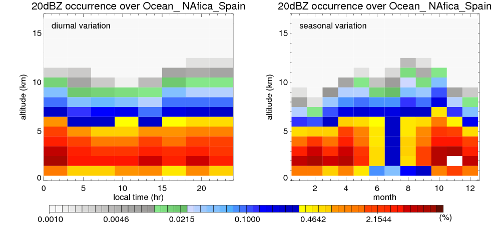 Here the precipitation means the precipitable hydrometeors (raindrops, snow flakes, graupel and hails) that detected by TRMM precipitation radar. Following figure shows the vertical profiles of 20, 30 and 40 dBZ fractional occurrence over Ocean_ NAfica_Spain in different seasons. The seasonal and diurnal variations of precipitation (20 dBZ) fractional occurrence at different altitudes are shown below: The seasonal and diurnal variations of INTENSIVE precipitation (40 dBZ) fractional occurrence at different altitudes are shown below: Clouds are consisted of small hydrometeors that undetectable by TRMM precipitation radar (Ku band). CloudSat (W band radar) provides the much great details of clouds. Following figure shows the vertical structure of the thin and thick clouds over Ocean_ NAfica_Spain. Note that high reflectivity at low levels are less frequent due to the attenuation. The seasonal variation of thin (-20 dBZ) and thick (0 dBZ) cloud over Ocean_ NAfica_Spain are shown below: |
