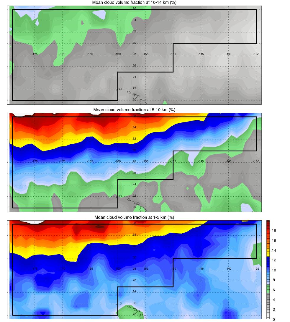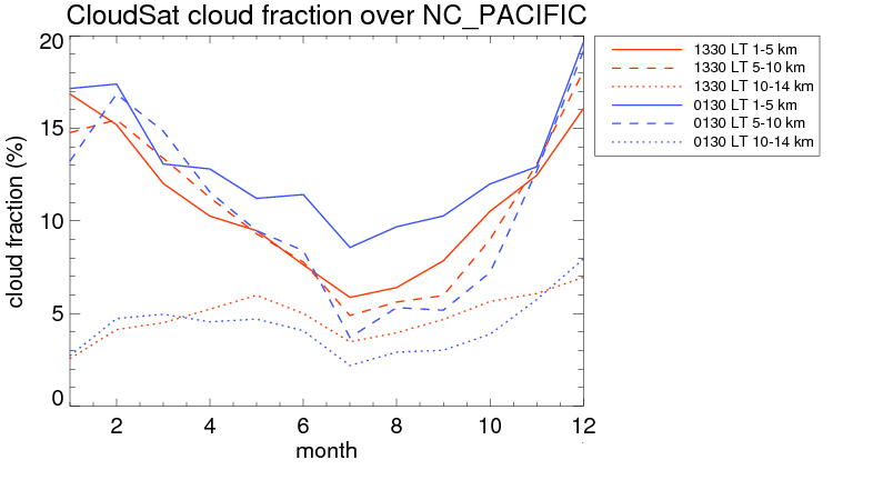 Over NC_PACIFIC , mean high level (10-14 km) cloud volume fraction is about 4.6%. Mean mid level (5-10 km) cloud volume fraction is about 10.4%. Mean low level (1-5 km) cloud volume fraction is about 11.5%. Seasonal and day vs. night variations of high, mid and low level cloud fraction over NC_PACIFIC are shown in following figure. You may check the details of cloud fraction in various seasons and at different local times. |