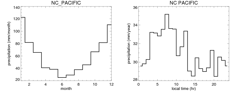 Over NC_PACIFIC , mean annual precipitation are estimated with 746.3 (mm/year) from precipitation radar, and 822.5 (mm/year) from microwave radiometer observations. (see high resolution precipitation product , NOTE: it may take long time to generate for large area) In total, thunderstorms (systems with detected lightning flashes) contribute 13 %, MCSs (Mesoscale convective systems with raining area > 2000 km^2) contribute 75 % of all precipitation. Seasonal and diurnal variations of rainfall over NC_PACIFIC are shown in following figure. You may check the details of rainfall contributions from precipitation systems with different sizes and intensities in various seasons and at different local times. |