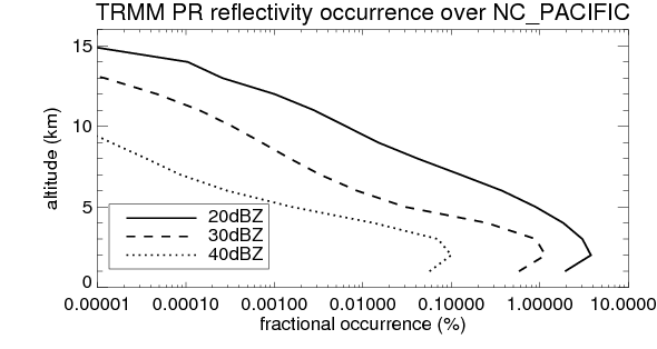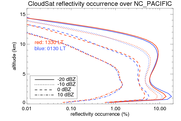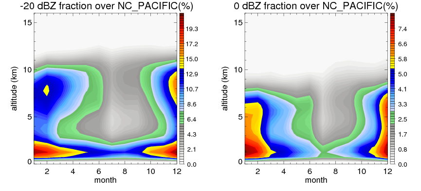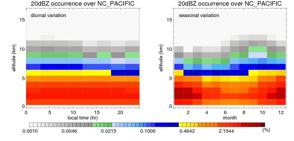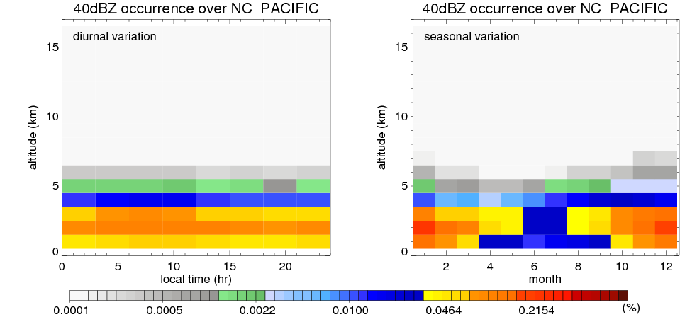 Here the precipitation means the precipitable hydrometeors (raindrops, snow flakes, graupel and hails) that detected by TRMM precipitation radar. Following figure shows the vertical profiles of 20, 30 and 40 dBZ fractional occurrence over NC_PACIFIC in different seasons. The seasonal and diurnal variations of precipitation (20 dBZ) fractional occurrence at different altitudes are shown below: The seasonal and diurnal variations of INTENSIVE precipitation (40 dBZ) fractional occurrence at different altitudes are shown below: Clouds are consisted of small hydrometeors that undetectable by TRMM precipitation radar (Ku band). CloudSat (W band radar) provides the much great details of clouds. Following figure shows the vertical structure of the thin and thick clouds over NC_PACIFIC. Note that high reflectivity at low levels are less frequent due to the attenuation. The seasonal variation of thin (-20 dBZ) and thick (0 dBZ) cloud over NC_PACIFIC are shown below: |
