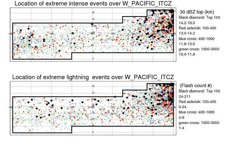 Following figure shows the location of the precipitation feautres categorized by the lightning rate and 30 dBZ echo top.