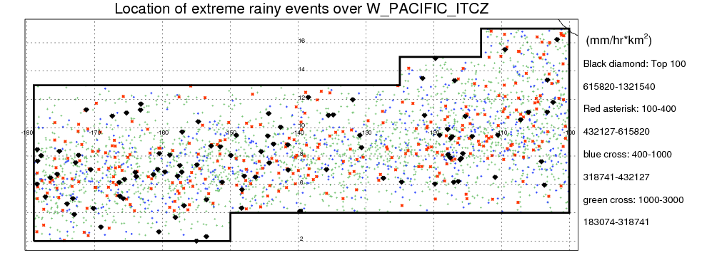 Following figure shows the location of the precipitation feautres categorized by the volumetric rainfall.