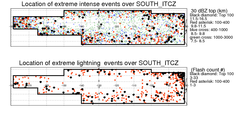 Following figure shows the location of the precipitation feautres categorized by the lightning rate and 30 dBZ echo top.