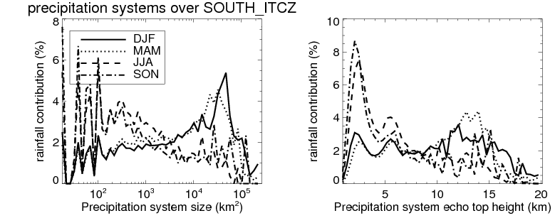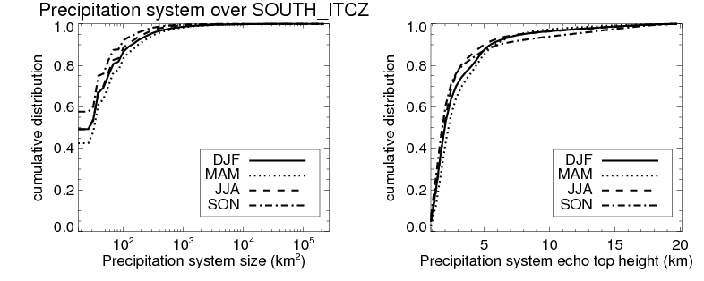 Over SOUTH_ITCZ , mean size of precipitation system about 142.8 (km^2) and mean maximum radar echo top height of these precipitation systems is about 3.3 km. Following figure shows the cumulative distribution of the sizes and depths of the precipitation systems in different seasons: Though usually there are more small systems, the larger systems would bring more total precipitation. |