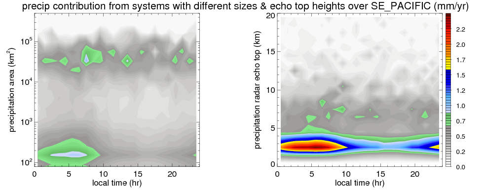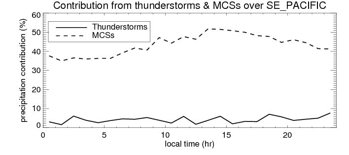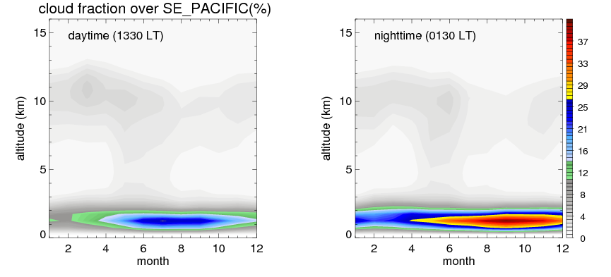Many studies suggested that the diurnal variation of the precipitation is related to the life cycles of the precipitation systems, which is frequently driven by the surface sensible heating. Over SE_PACIFIC, mean annual precipitation are estimated with 180.5 (mm/year) from precipitation radar. Detailed diurnal variation of the precipitation at high resolution can be accessed here (NOTE: it may take long time to generate for a large area). The diurnal variation of precipitation from systems with different sizes and heights are shown below: In total, thunderstorms (systems with detected lightning flashes) contribute 4 %, MCSs (Mesoscale convective systems with raining area > 2000 km^2) contribute 42 % of all precipitation over SE_PACIFIC. Diurnal variations of fraction of precipitation from thunderstorms and MCSs over SE_PACIFIC are shown below: Certainly there is a strong diurnal variation of different types of clouds. Because CloudSat observes at 0130 and 1330 local time, here the daytime and night cloud fraction in different seasons are presented: |