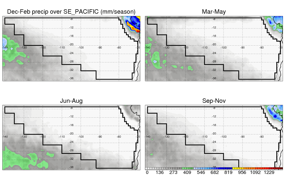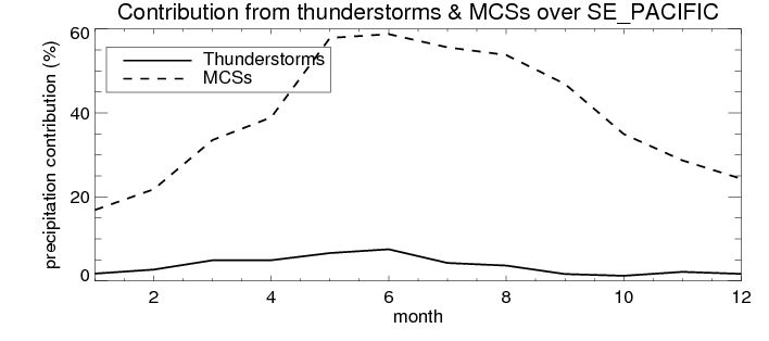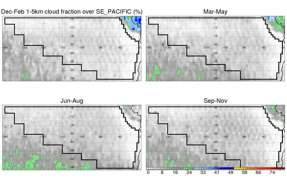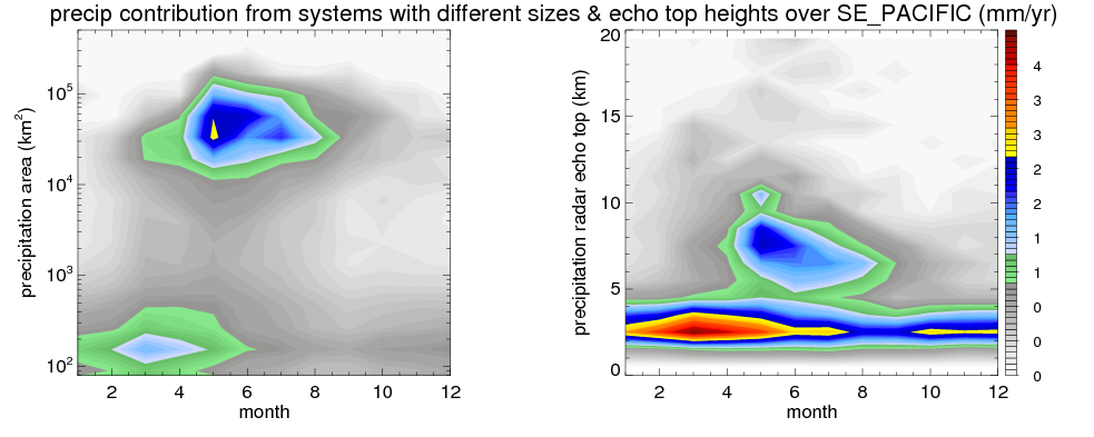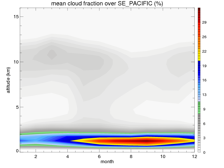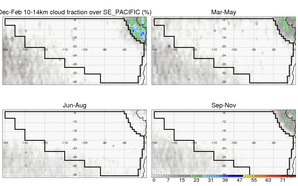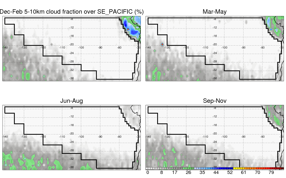 Over SE_PACIFIC , mean annual precipitation are estimated with 180.5 (mm/year) from TRMM precipitation radar. (distribution of precipitation see here ) Total surface rainfall is brought by various precipitation systems. The seasonal variation of precipitation from systems with different sizes and heights are shown below: In total, thunderstorms (systems with detected lightning flashes) contribute 4 %, MCSs (Mesoscale convective systems with raining area > 2000 km^2) contribute 42 % of all precipitation. Seasonal variations of fraction of precipitation from thunderstorms and MCSs are shown below: The seasonal variation of geographical distribution of CloudSat cloud fraction over SE_PACIFIC is shown below: The seasonal variation of mean CloudSat level cloud fraction at different altitudes over SE_PACIFIC is shown below: |