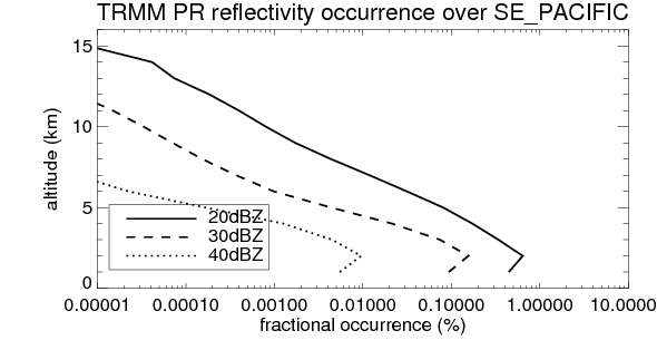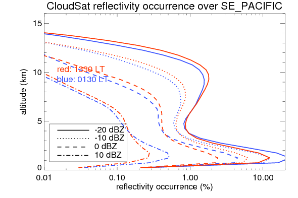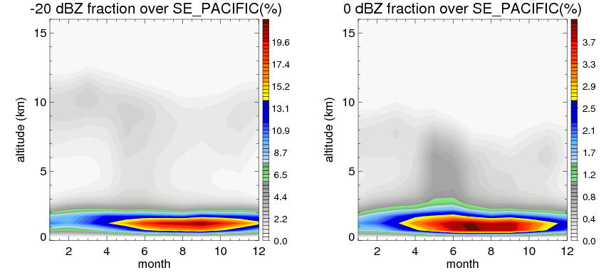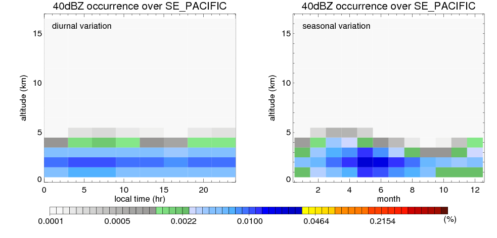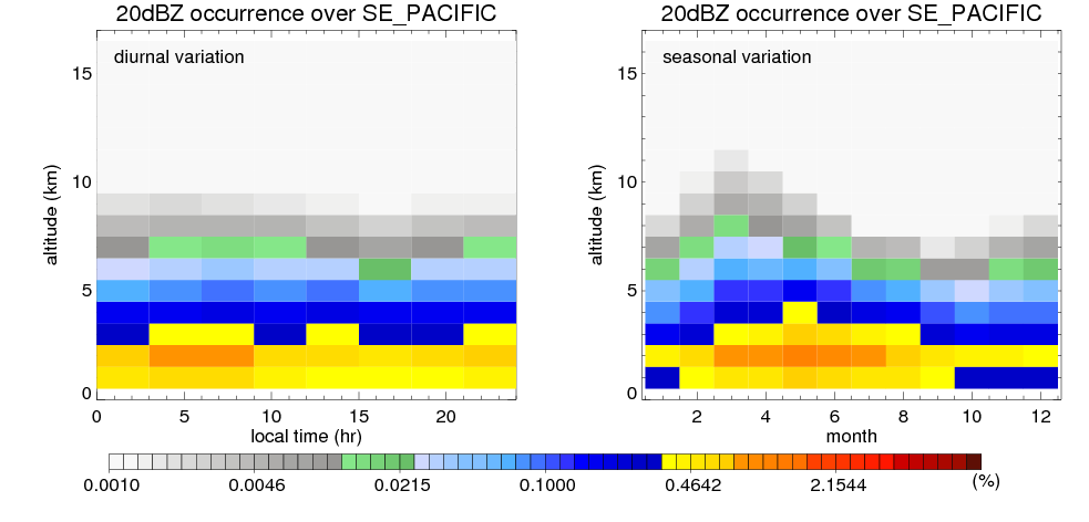 Here the precipitation means the precipitable hydrometeors (raindrops, snow flakes, graupel and hails) that detected by TRMM precipitation radar. Following figure shows the vertical profiles of 20, 30 and 40 dBZ fractional occurrence over SE_PACIFIC in different seasons. The seasonal and diurnal variations of precipitation (20 dBZ) fractional occurrence at different altitudes are shown below: The seasonal and diurnal variations of INTENSIVE precipitation (40 dBZ) fractional occurrence at different altitudes are shown below: Clouds are consisted of small hydrometeors that undetectable by TRMM precipitation radar (Ku band). CloudSat (W band radar) provides the much great details of clouds. Following figure shows the vertical structure of the thin and thick clouds over SE_PACIFIC. Note that high reflectivity at low levels are less frequent due to the attenuation. The seasonal variation of thin (-20 dBZ) and thick (0 dBZ) cloud over SE_PACIFIC are shown below: |