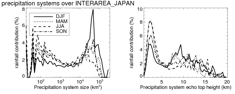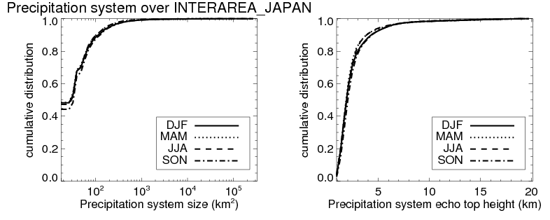 Over INTERAREA_JAPAN , mean size of precipitation system about 106.1 (km^2) and mean maximum radar echo top height of these precipitation systems is about 2.8 km. Following figure shows the cumulative distribution of the sizes and depths of the precipitation systems in different seasons: Though usually there are more small systems, the larger systems would bring more total precipitation. |