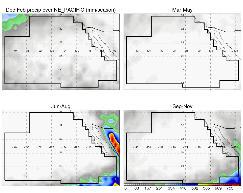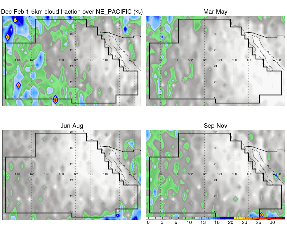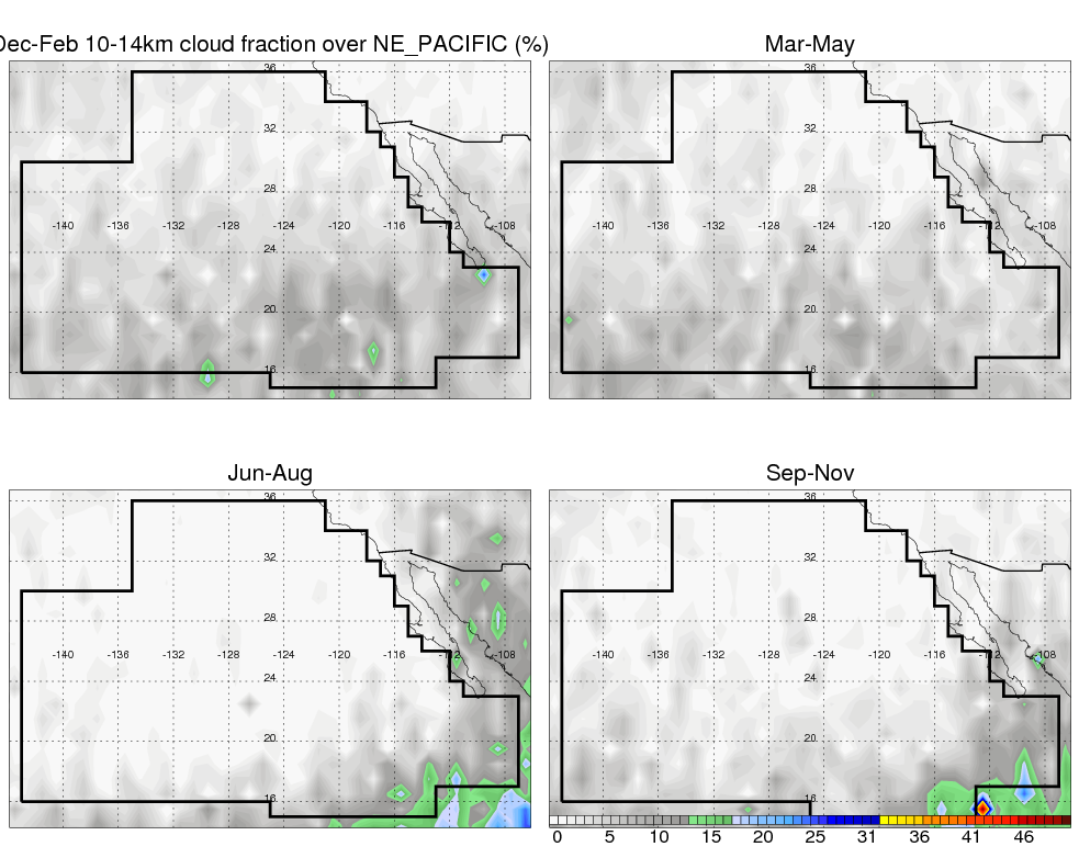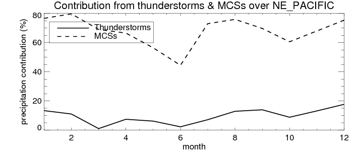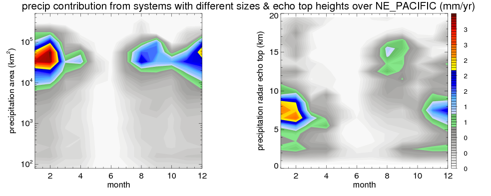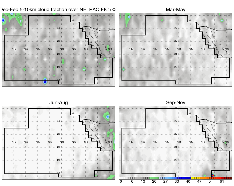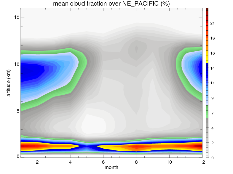 Over NE_PACIFIC , mean annual precipitation are estimated with 145.5 (mm/year) from TRMM precipitation radar. (distribution of precipitation see here ) Total surface rainfall is brought by various precipitation systems. The seasonal variation of precipitation from systems with different sizes and heights are shown below: In total, thunderstorms (systems with detected lightning flashes) contribute 11 %, MCSs (Mesoscale convective systems with raining area > 2000 km^2) contribute 72 % of all precipitation. Seasonal variations of fraction of precipitation from thunderstorms and MCSs are shown below: The seasonal variation of geographical distribution of CloudSat cloud fraction over NE_PACIFIC is shown below: The seasonal variation of mean CloudSat level cloud fraction at different altitudes over NE_PACIFIC is shown below: |