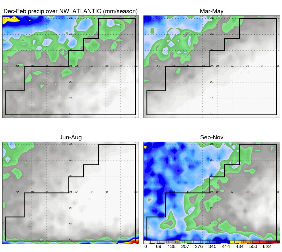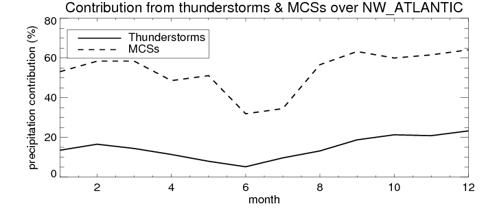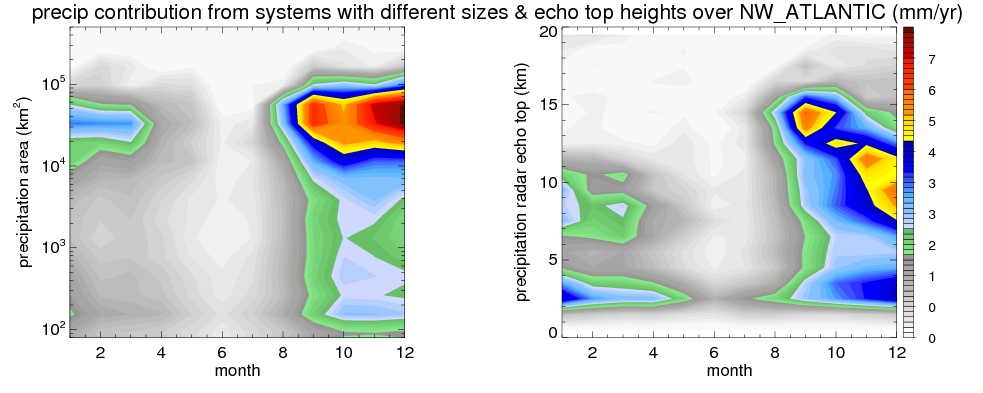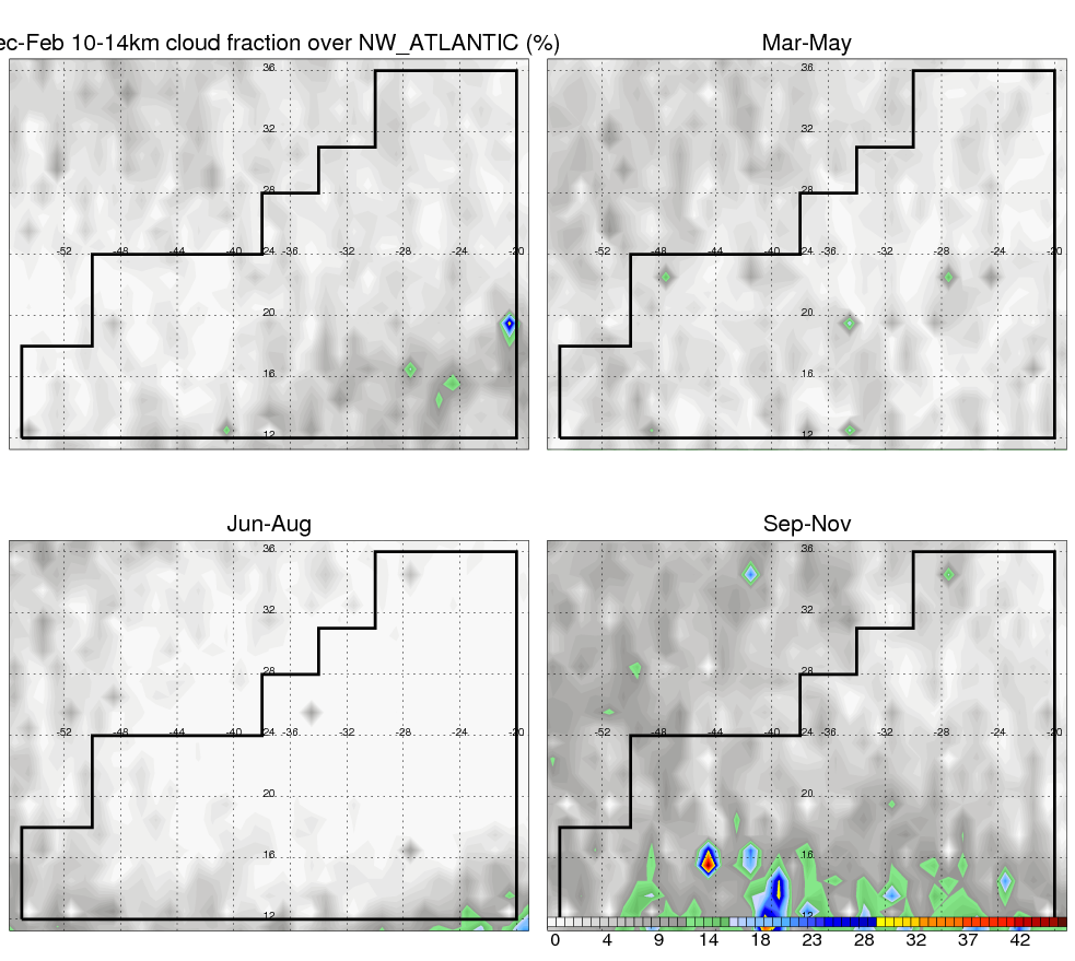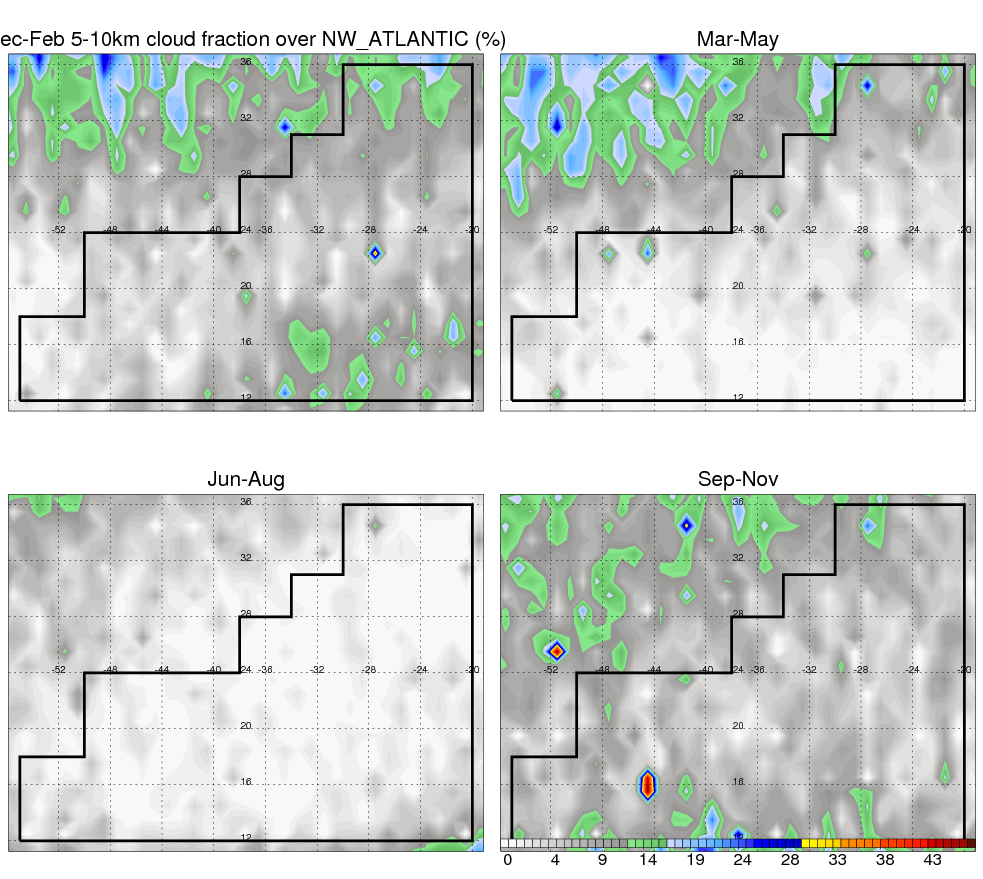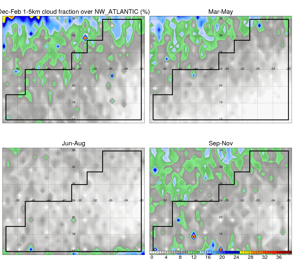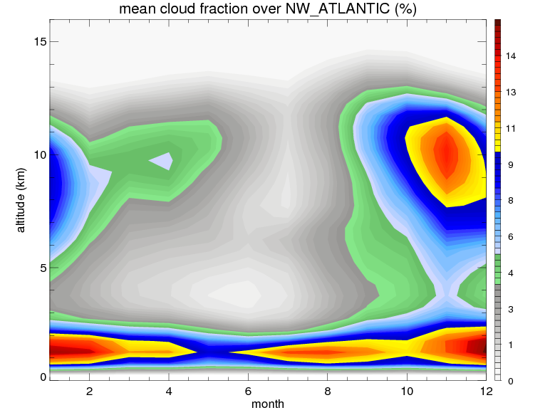 Over NW_ATLANTIC , mean annual precipitation are estimated with 378.0 (mm/year) from TRMM precipitation radar. (distribution of precipitation see here ) Total surface rainfall is brought by various precipitation systems. The seasonal variation of precipitation from systems with different sizes and heights are shown below: In total, thunderstorms (systems with detected lightning flashes) contribute 17 %, MCSs (Mesoscale convective systems with raining area > 2000 km^2) contribute 58 % of all precipitation. Seasonal variations of fraction of precipitation from thunderstorms and MCSs are shown below: The seasonal variation of geographical distribution of CloudSat cloud fraction over NW_ATLANTIC is shown below: The seasonal variation of mean CloudSat level cloud fraction at different altitudes over NW_ATLANTIC is shown below: |