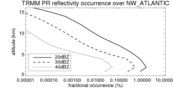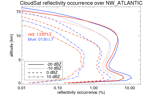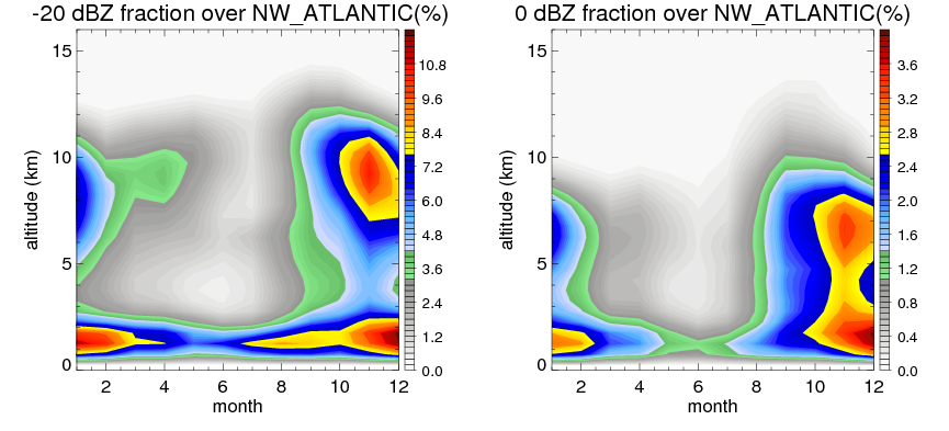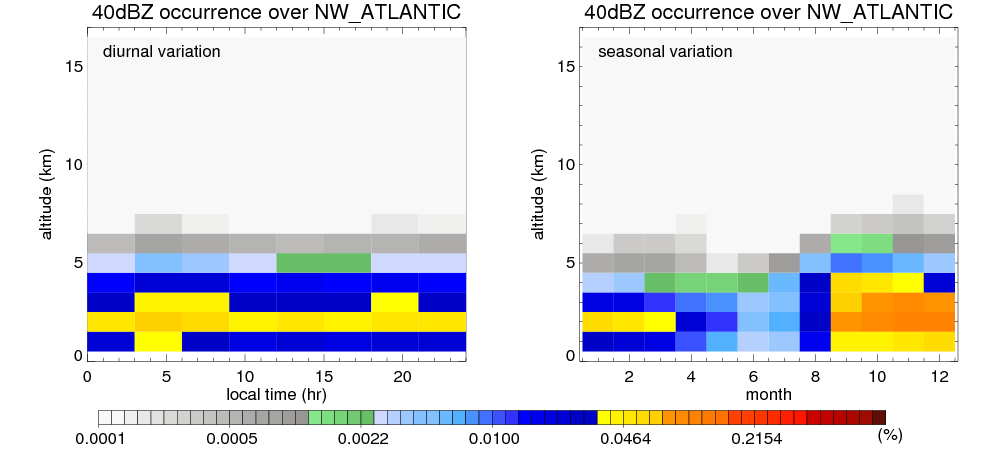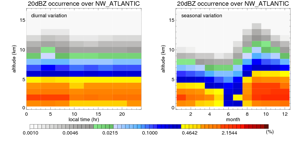 Here the precipitation means the precipitable hydrometeors (raindrops, snow flakes, graupel and hails) that detected by TRMM precipitation radar. Following figure shows the vertical profiles of 20, 30 and 40 dBZ fractional occurrence over NW_ATLANTIC in different seasons. The seasonal and diurnal variations of precipitation (20 dBZ) fractional occurrence at different altitudes are shown below: The seasonal and diurnal variations of INTENSIVE precipitation (40 dBZ) fractional occurrence at different altitudes are shown below: Clouds are consisted of small hydrometeors that undetectable by TRMM precipitation radar (Ku band). CloudSat (W band radar) provides the much great details of clouds. Following figure shows the vertical structure of the thin and thick clouds over NW_ATLANTIC. Note that high reflectivity at low levels are less frequent due to the attenuation. The seasonal variation of thin (-20 dBZ) and thick (0 dBZ) cloud over NW_ATLANTIC are shown below: |