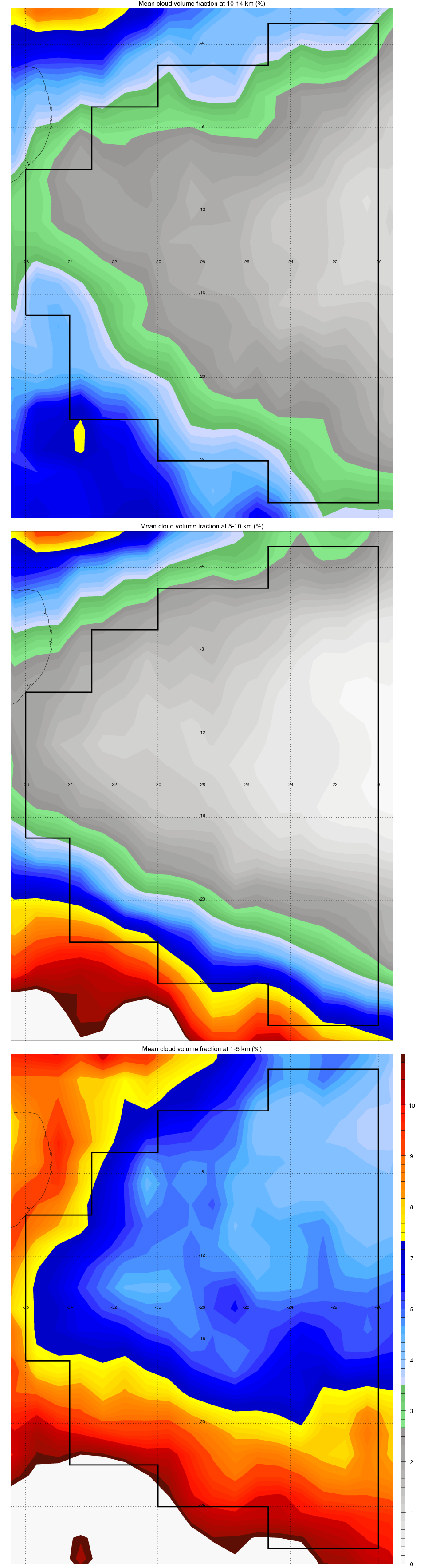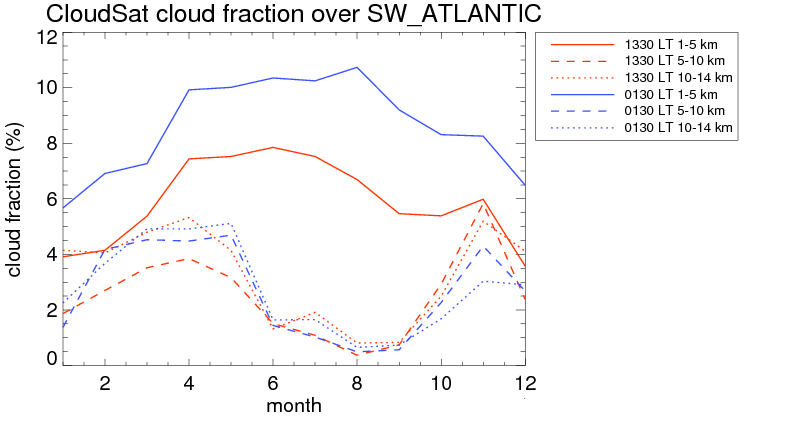 Over SW_ATLANTIC , mean high level (10-14 km) cloud volume fraction is about 3.0%. Mean mid level (5-10 km) cloud volume fraction is about 2.5%. Mean low level (1-5 km) cloud volume fraction is about 7.0%. Seasonal and day vs. night variations of high, mid and low level cloud fraction over SW_ATLANTIC are shown in following figure. You may check the details of cloud fraction in various seasons and at different local times. |