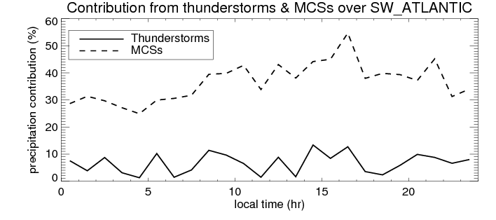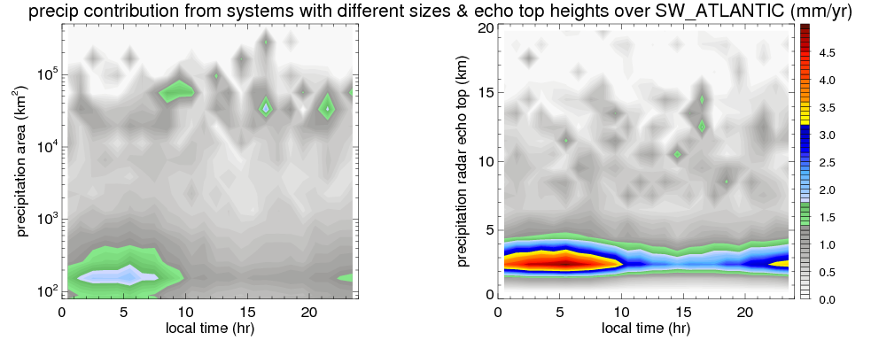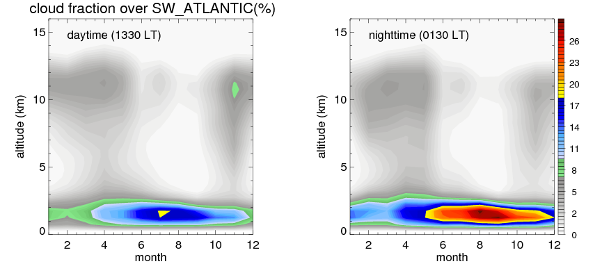 Many studies suggested that the diurnal variation of the precipitation is related to the life cycles of the precipitation systems, which is frequently driven by the surface sensible heating. Over SW_ATLANTIC, mean annual precipitation are estimated with 341.6 (mm/year) from precipitation radar. Detailed diurnal variation of the precipitation at high resolution can be accessed here (NOTE: it may take long time to generate for a large area). The diurnal variation of precipitation from systems with different sizes and heights are shown below: In total, thunderstorms (systems with detected lightning flashes) contribute 6 %, MCSs (Mesoscale convective systems with raining area > 2000 km^2) contribute 36 % of all precipitation over SW_ATLANTIC. Diurnal variations of fraction of precipitation from thunderstorms and MCSs over SW_ATLANTIC are shown below: Certainly there is a strong diurnal variation of different types of clouds. Because CloudSat observes at 0130 and 1330 local time, here the daytime and night cloud fraction in different seasons are presented: |