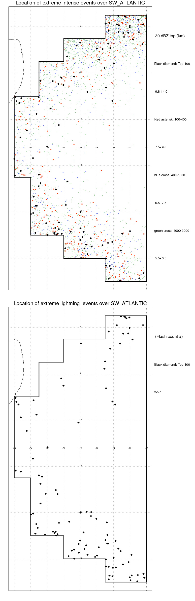 Following figure shows the location of the precipitation feautres categorized by the lightning rate and 30 dBZ echo top.