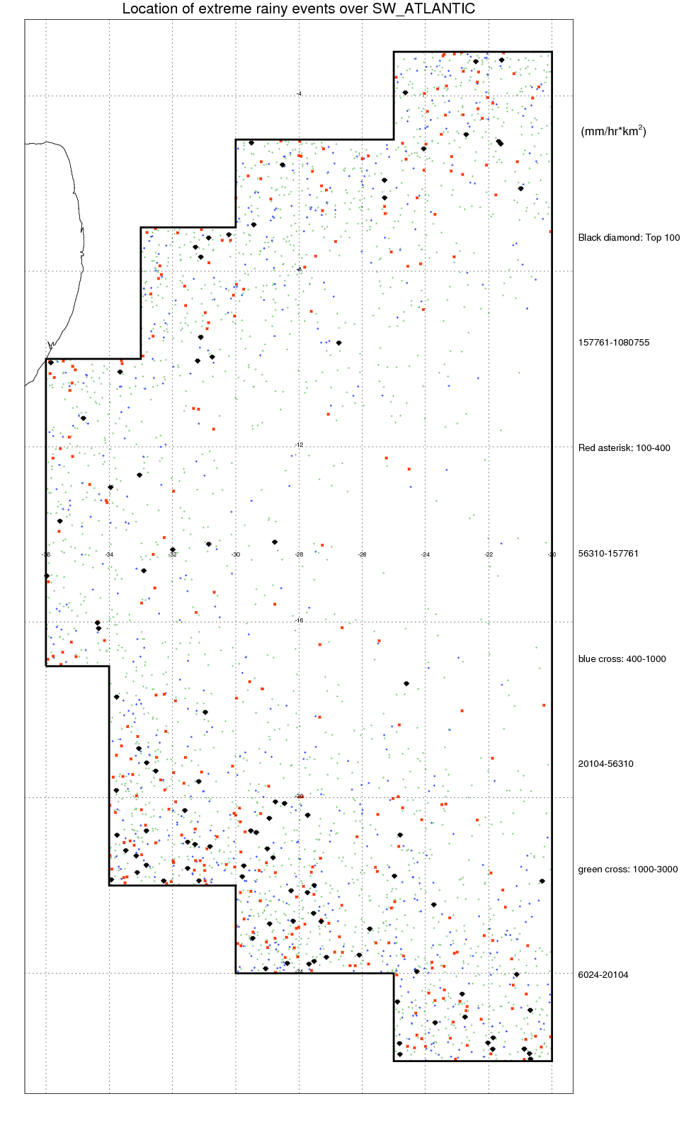 Following figure shows the location of the precipitation feautres categorized by the volumetric rainfall.