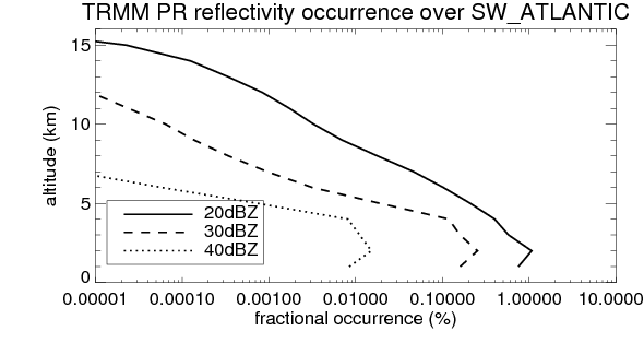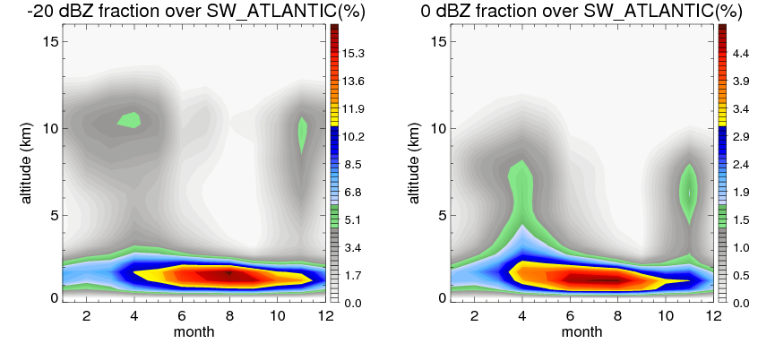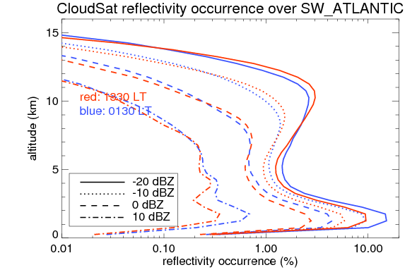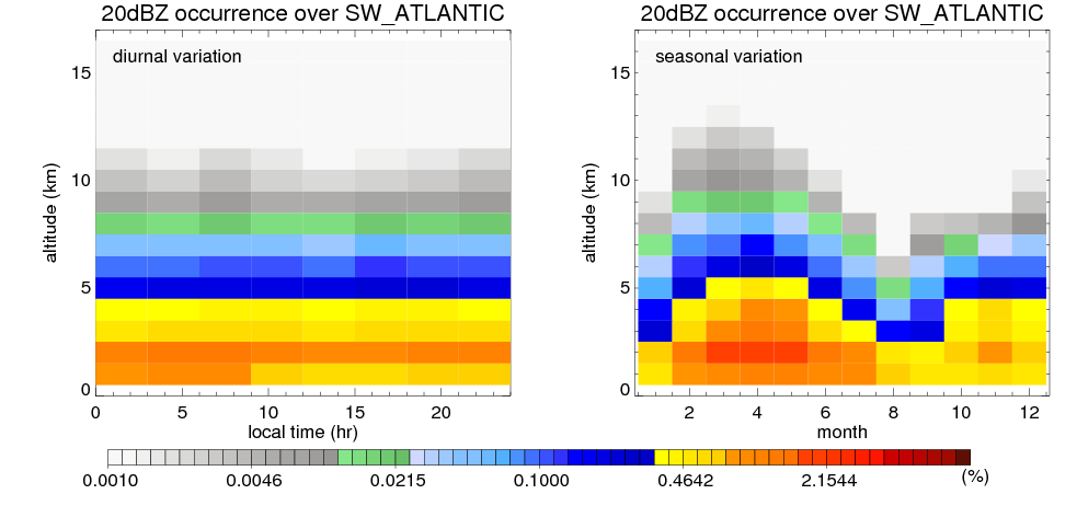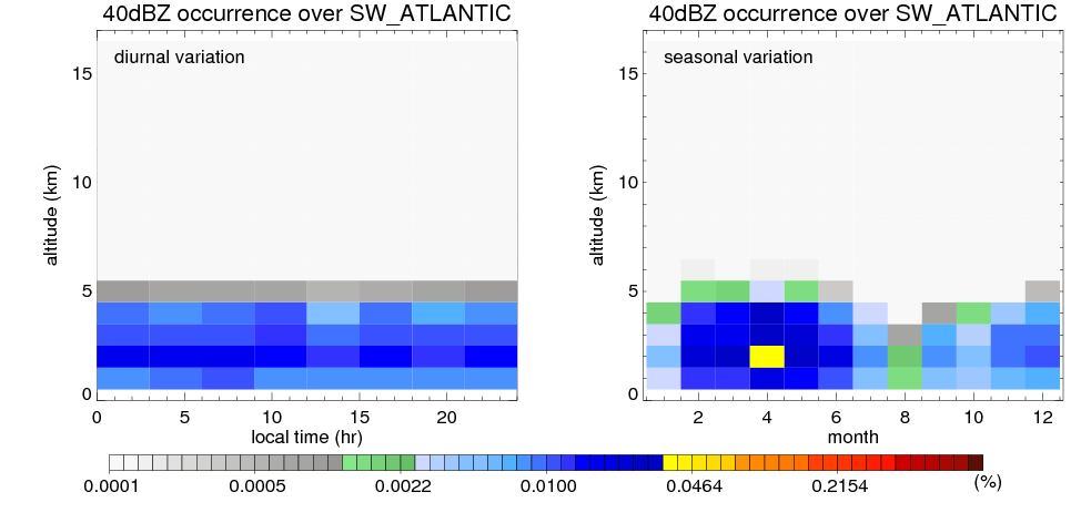 Here the precipitation means the precipitable hydrometeors (raindrops, snow flakes, graupel and hails) that detected by TRMM precipitation radar. Following figure shows the vertical profiles of 20, 30 and 40 dBZ fractional occurrence over SW_ATLANTIC in different seasons. The seasonal and diurnal variations of precipitation (20 dBZ) fractional occurrence at different altitudes are shown below: The seasonal and diurnal variations of INTENSIVE precipitation (40 dBZ) fractional occurrence at different altitudes are shown below: Clouds are consisted of small hydrometeors that undetectable by TRMM precipitation radar (Ku band). CloudSat (W band radar) provides the much great details of clouds. Following figure shows the vertical structure of the thin and thick clouds over SW_ATLANTIC. Note that high reflectivity at low levels are less frequent due to the attenuation. The seasonal variation of thin (-20 dBZ) and thick (0 dBZ) cloud over SW_ATLANTIC are shown below: |