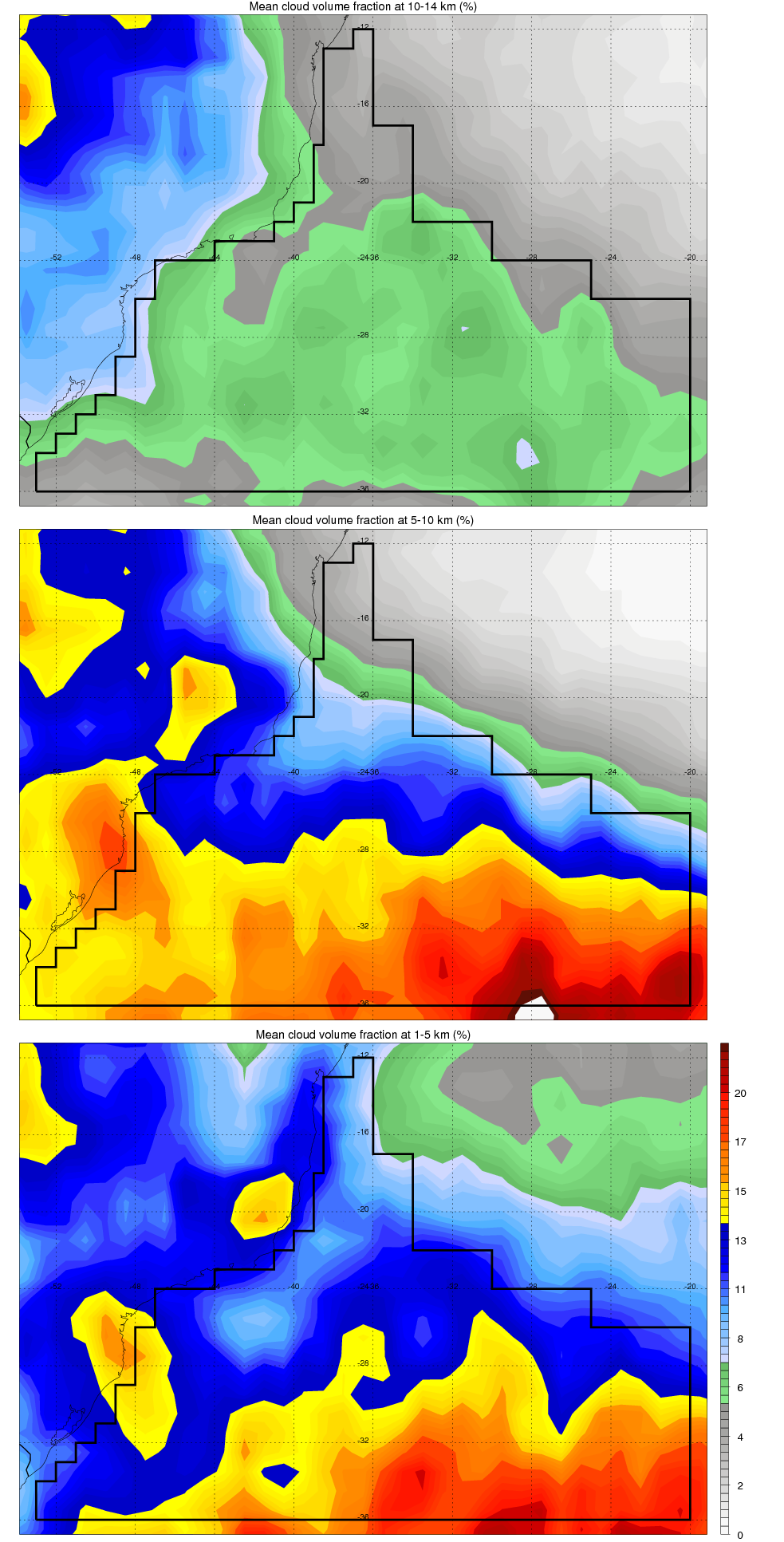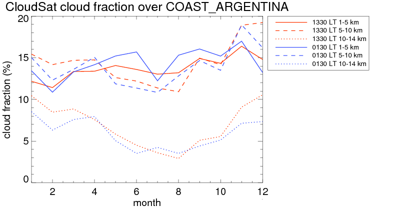 Over COAST_ARGENTINA , mean high level (10-14 km) cloud volume fraction is about 6.4%. Mean mid level (5-10 km) cloud volume fraction is about 14.2%. Mean low level (1-5 km) cloud volume fraction is about 14.0%. Seasonal and day vs. night variations of high, mid and low level cloud fraction over COAST_ARGENTINA are shown in following figure. You may check the details of cloud fraction in various seasons and at different local times. |