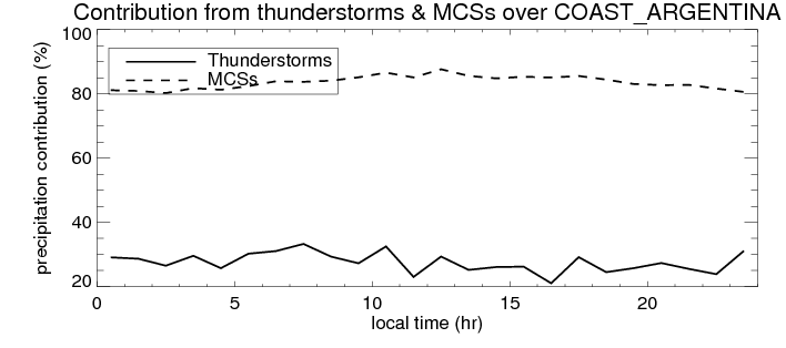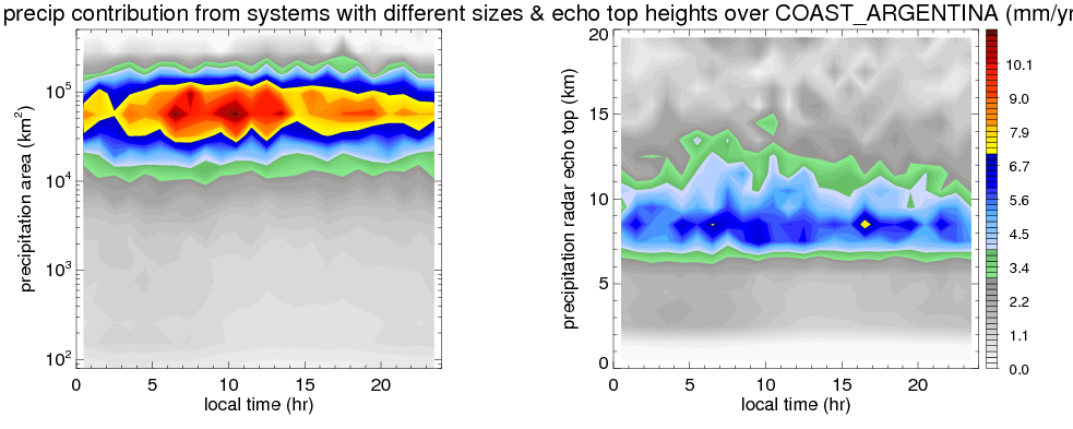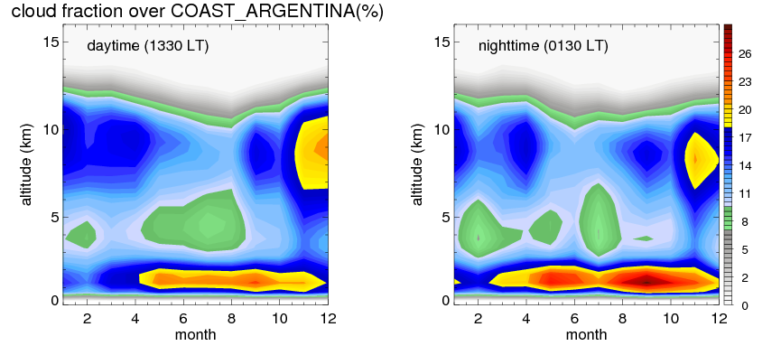 Many studies suggested that the diurnal variation of the precipitation is related to the life cycles of the precipitation systems, which is frequently driven by the surface sensible heating. Over COAST_ARGENTINA, mean annual precipitation are estimated with 1164.4 (mm/year) from precipitation radar. Detailed diurnal variation of the precipitation at high resolution can be accessed here (NOTE: it may take long time to generate for a large area). The diurnal variation of precipitation from systems with different sizes and heights are shown below: In total, thunderstorms (systems with detected lightning flashes) contribute 27 %, MCSs (Mesoscale convective systems with raining area > 2000 km^2) contribute 83 % of all precipitation over COAST_ARGENTINA. Diurnal variations of fraction of precipitation from thunderstorms and MCSs over COAST_ARGENTINA are shown below: Certainly there is a strong diurnal variation of different types of clouds. Because CloudSat observes at 0130 and 1330 local time, here the daytime and night cloud fraction in different seasons are presented: |