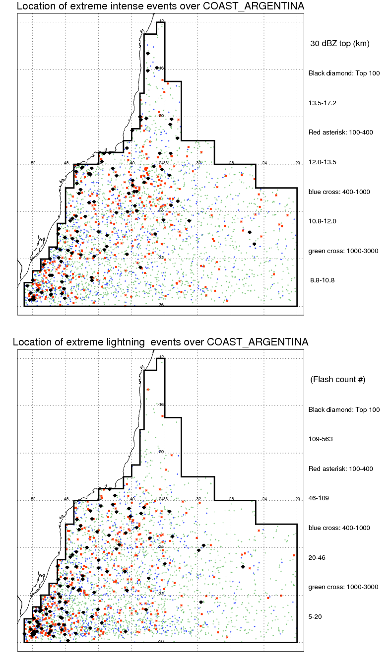 Following figure shows the location of the precipitation feautres categorized by the lightning rate and 30 dBZ echo top.