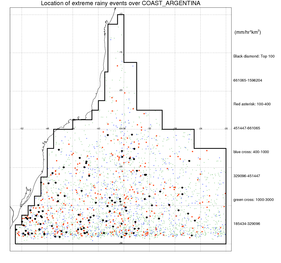 Following figure shows the location of the precipitation feautres categorized by the volumetric rainfall.