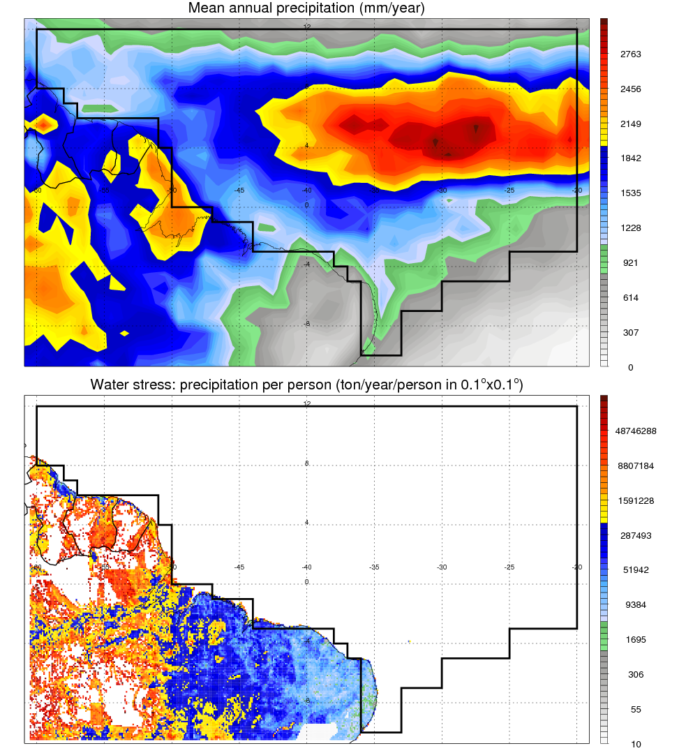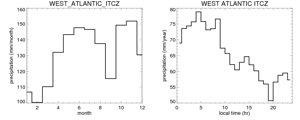 Over WEST_ATLANTIC_ITCZ , mean annual precipitation are estimated with 1572.4 (mm/year) from precipitation radar, and 1484.8 (mm/year) from microwave radiometer observations. (see high resolution precipitation product , NOTE: it may take long time to generate for large area) In total, thunderstorms (systems with detected lightning flashes) contribute 9 %, MCSs (Mesoscale convective systems with raining area > 2000 km^2) contribute 68 % of all precipitation. Seasonal and diurnal variations of rainfall over WEST_ATLANTIC_ITCZ are shown in following figure. You may check the details of rainfall contributions from precipitation systems with different sizes and intensities in various seasons and at different local times. |