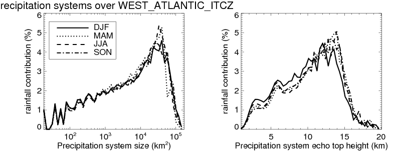 Over WEST_ATLANTIC_ITCZ , mean size of precipitation system about 257.1 (km^2) and mean maximum radar echo top height of these precipitation systems is about 4.0 km. Following figure shows the cumulative distribution of the sizes and depths of the precipitation systems in different seasons: Though usually there are more small systems, the larger systems would bring more total precipitation. |