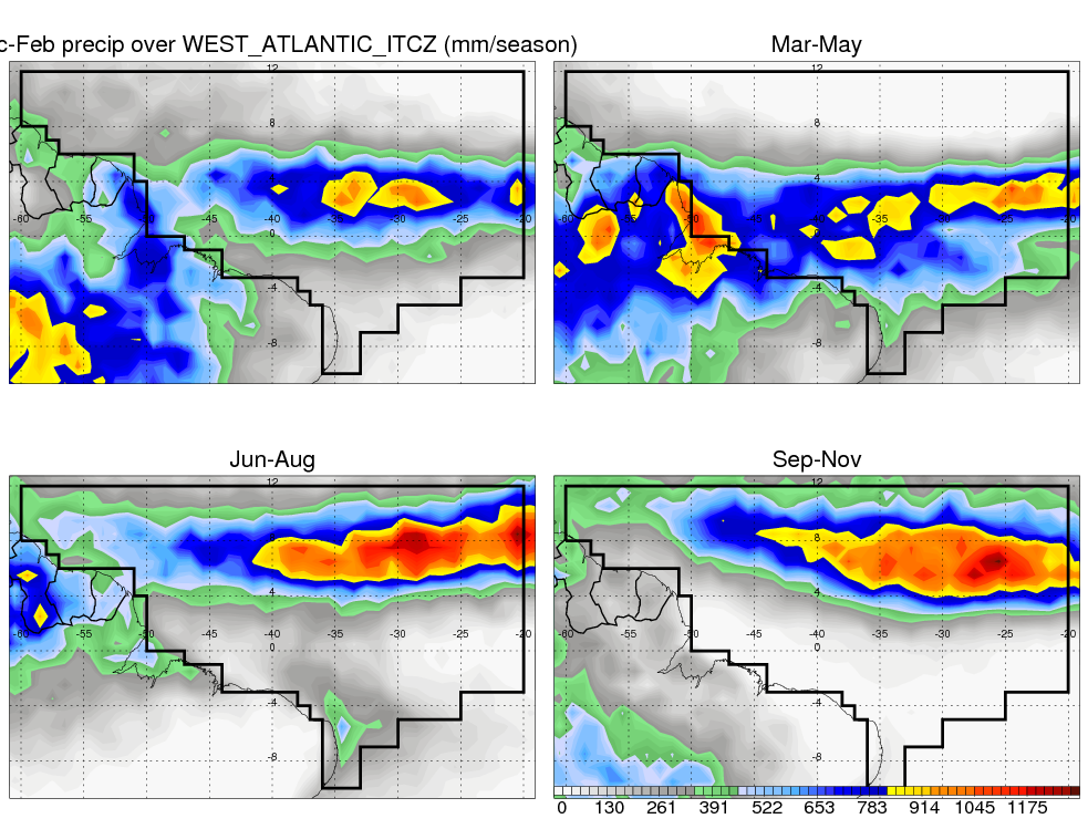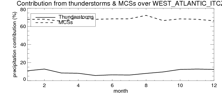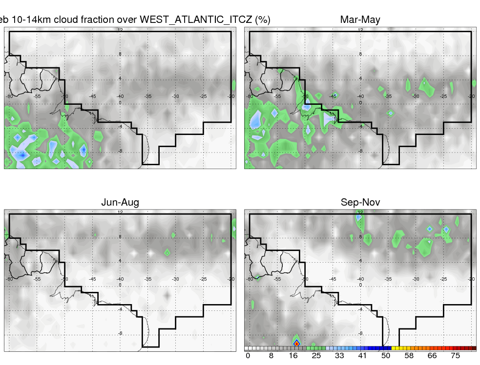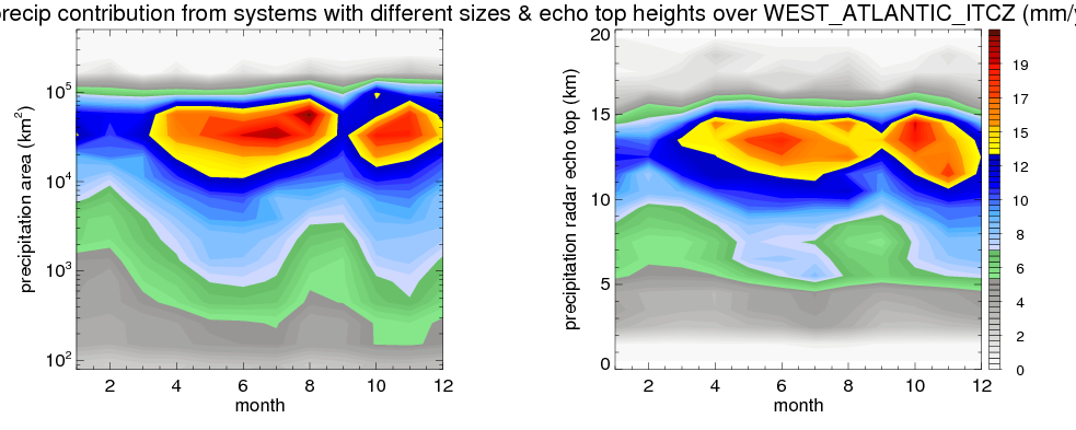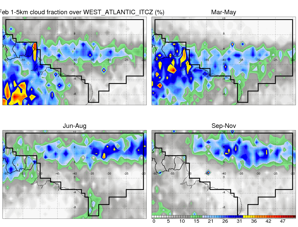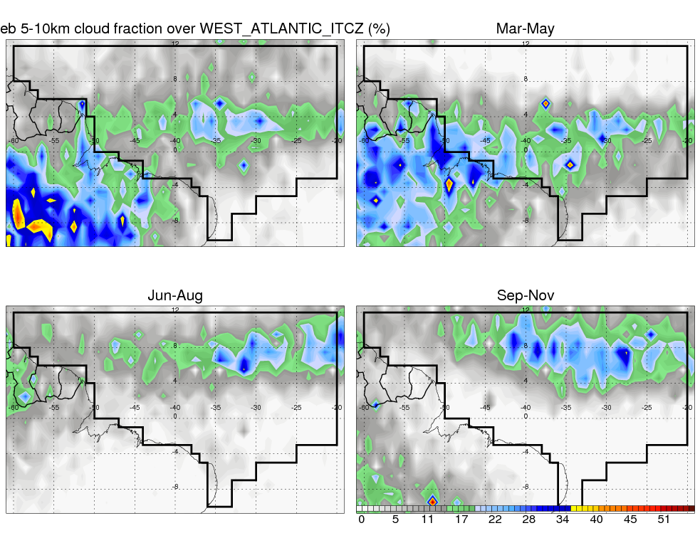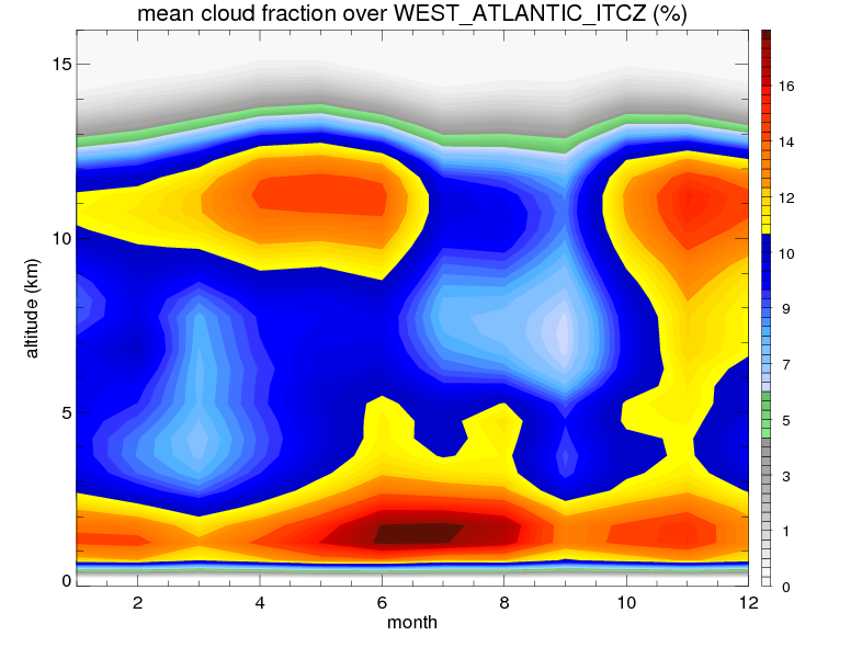 Over WEST_ATLANTIC_ITCZ , mean annual precipitation are estimated with 1572.4 (mm/year) from TRMM precipitation radar. (distribution of precipitation see here ) Total surface rainfall is brought by various precipitation systems. The seasonal variation of precipitation from systems with different sizes and heights are shown below: In total, thunderstorms (systems with detected lightning flashes) contribute 9 %, MCSs (Mesoscale convective systems with raining area > 2000 km^2) contribute 68 % of all precipitation. Seasonal variations of fraction of precipitation from thunderstorms and MCSs are shown below: The seasonal variation of geographical distribution of CloudSat cloud fraction over WEST_ATLANTIC_ITCZ is shown below: The seasonal variation of mean CloudSat level cloud fraction at different altitudes over WEST_ATLANTIC_ITCZ is shown below: |