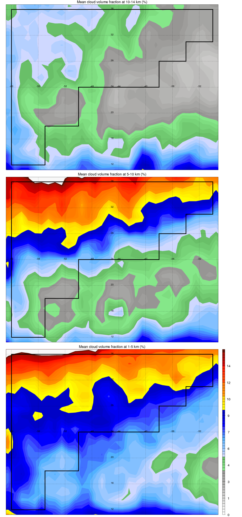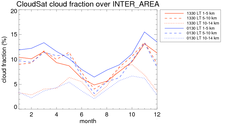 Over INTER_AREA , mean high level (10-14 km) cloud volume fraction is about 4.8%. Mean mid level (5-10 km) cloud volume fraction is about 8.9%. Mean low level (1-5 km) cloud volume fraction is about 9.7%. Seasonal and day vs. night variations of high, mid and low level cloud fraction over INTER_AREA are shown in following figure. You may check the details of cloud fraction in various seasons and at different local times. |