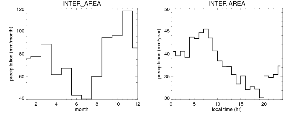 Over INTER_AREA , mean annual precipitation are estimated with 908.5 (mm/year) from precipitation radar, and 820.0 (mm/year) from microwave radiometer observations. (see high resolution precipitation product , NOTE: it may take long time to generate for large area) In total, thunderstorms (systems with detected lightning flashes) contribute 18 %, MCSs (Mesoscale convective systems with raining area > 2000 km^2) contribute 66 % of all precipitation. Seasonal and diurnal variations of rainfall over INTER_AREA are shown in following figure. You may check the details of rainfall contributions from precipitation systems with different sizes and intensities in various seasons and at different local times. |